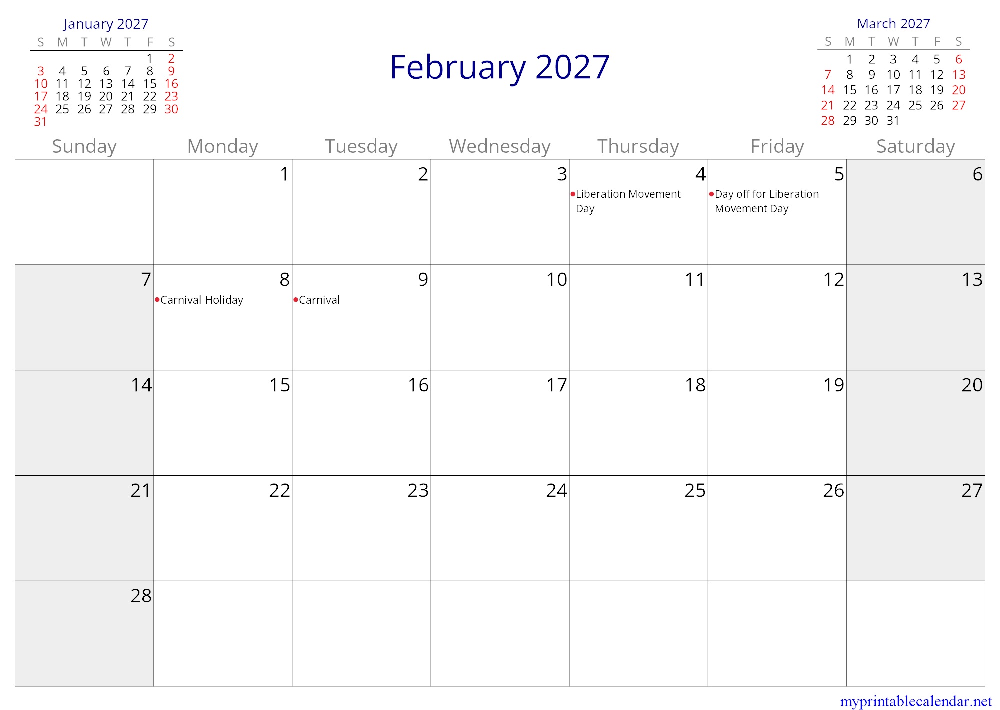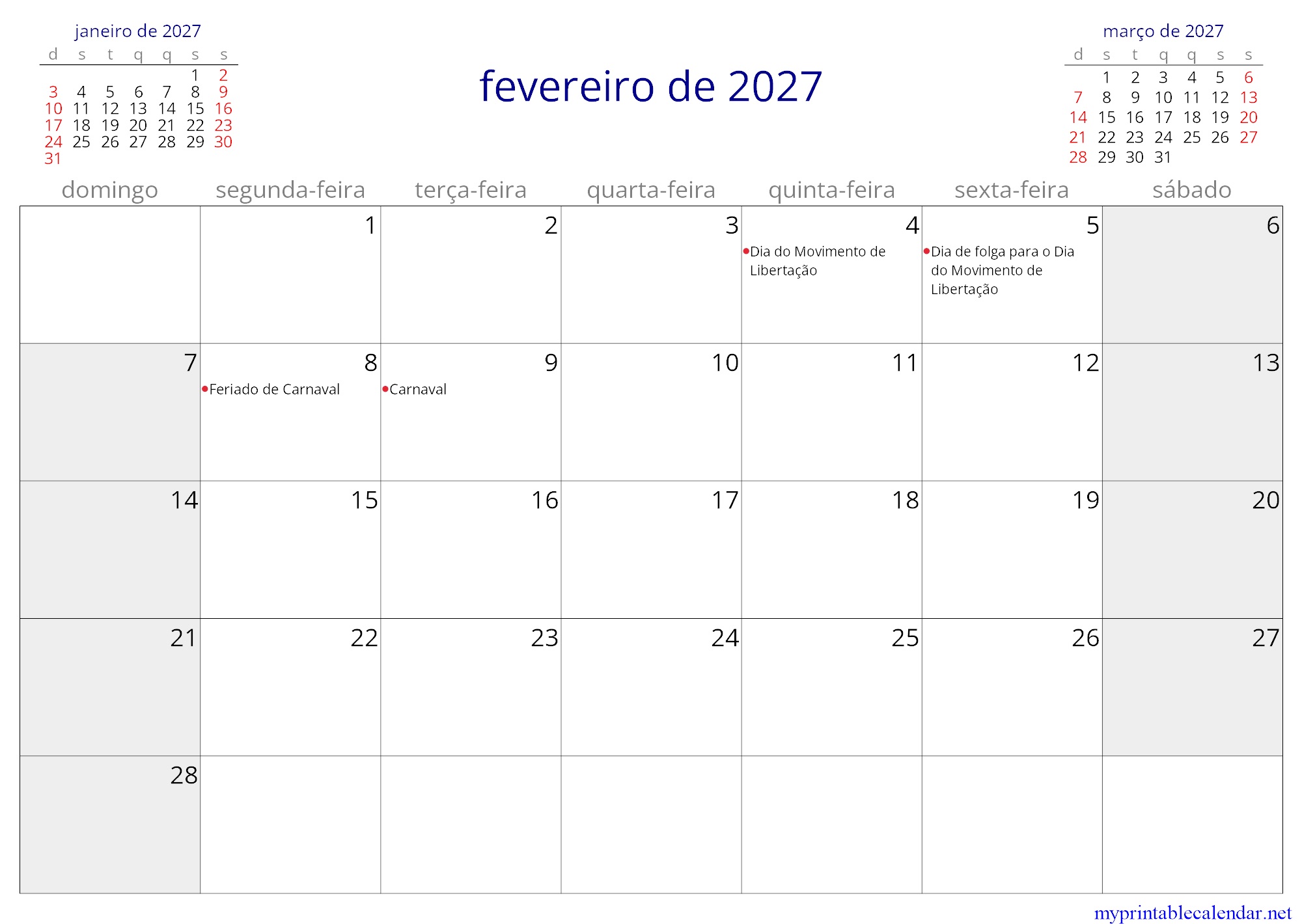 fevereiro de 2027 monthly calendar, Angola, Portuguese jpg