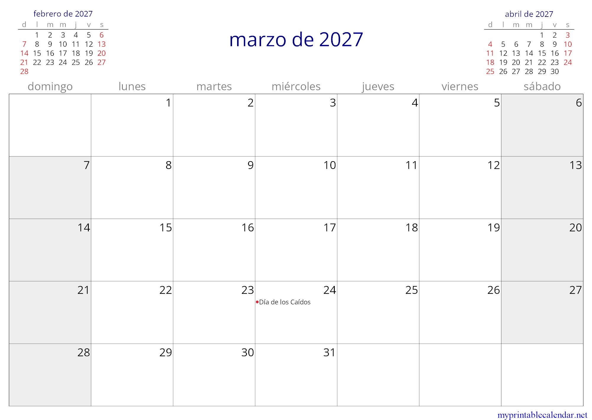 marzo de 2027 monthly calendar, Argentina, Spanish jpg