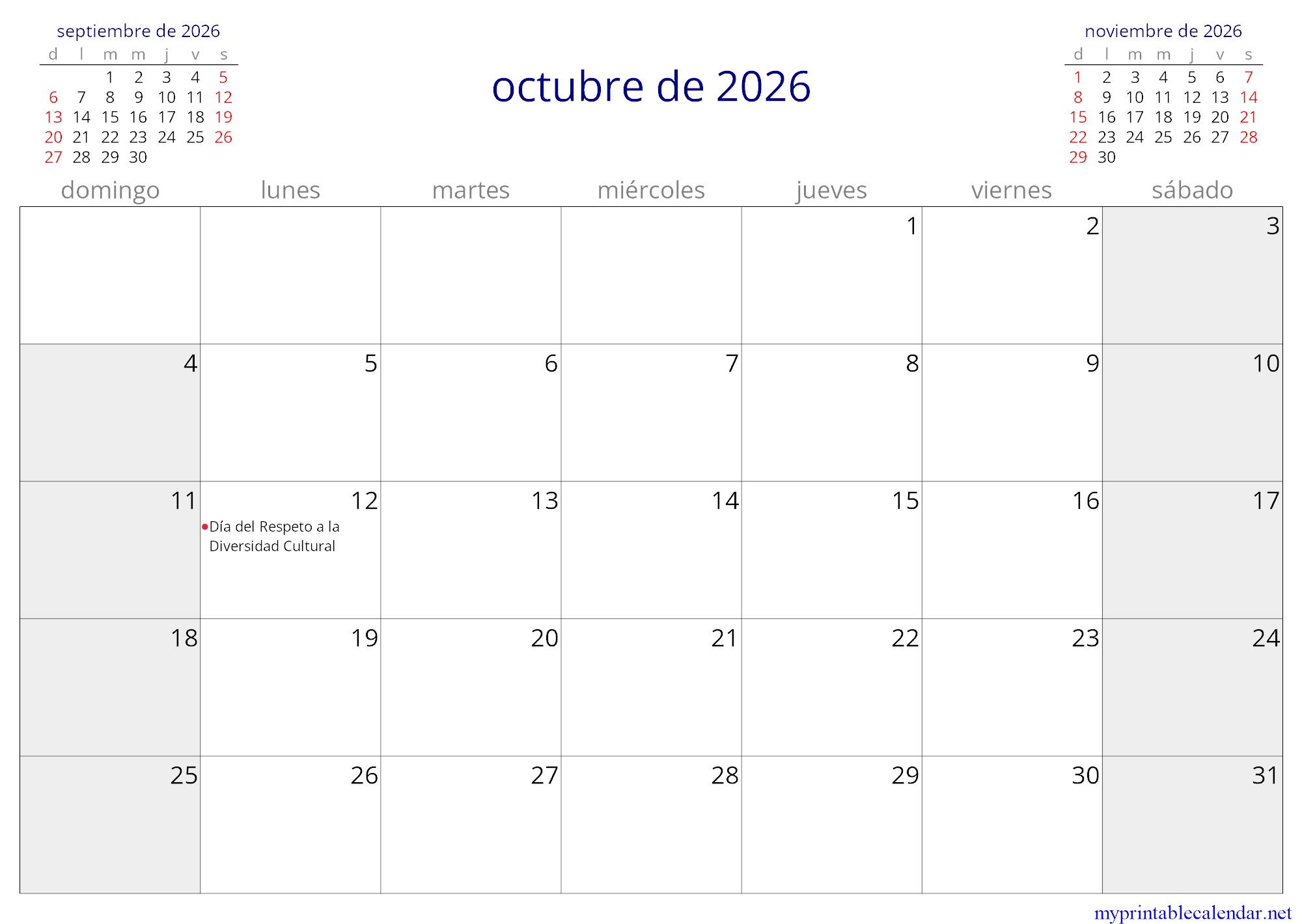 octubre de 2026 monthly calendar, Argentina, Spanish jpg