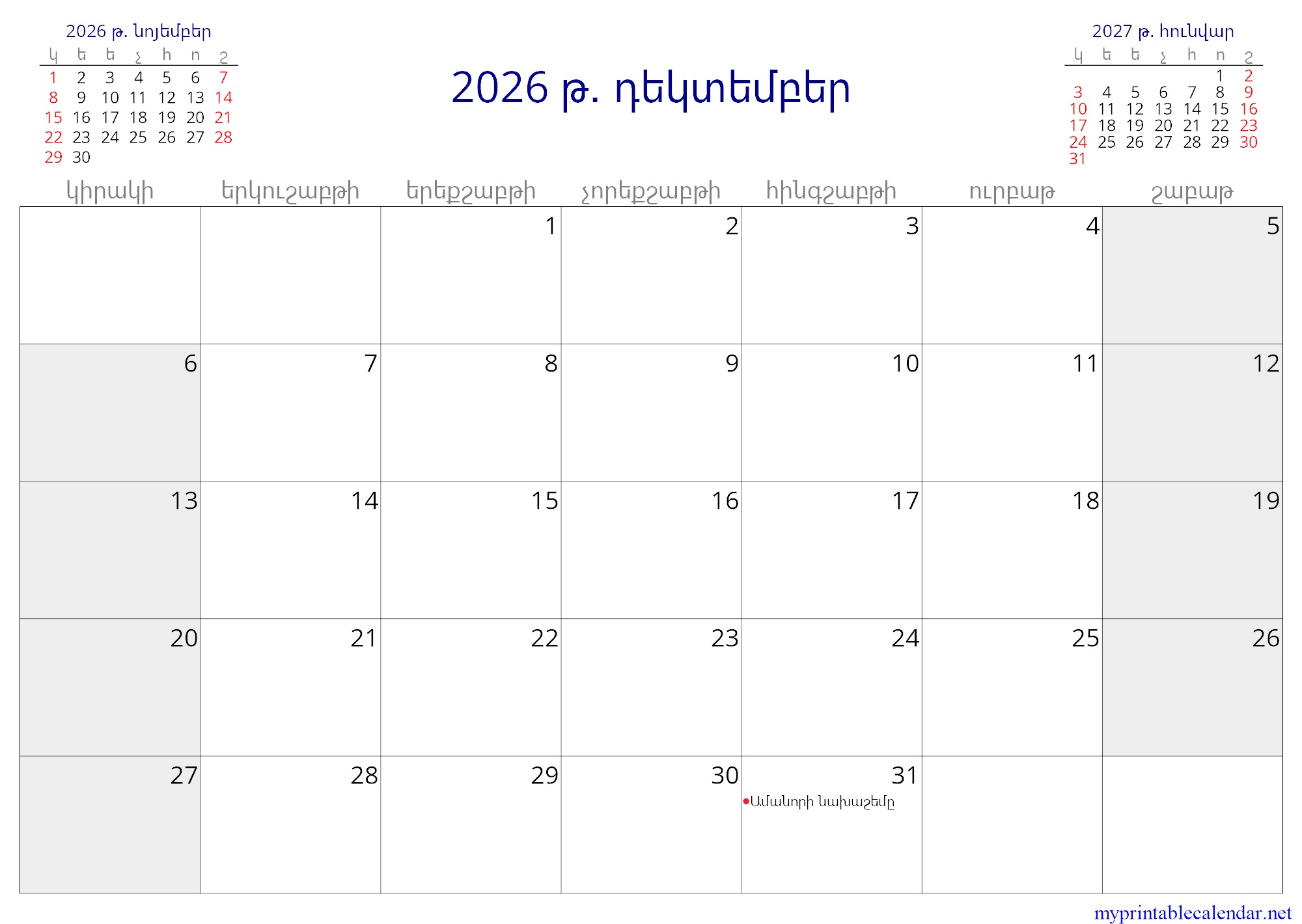 2026 թ․ դեկտեմբեր monthly calendar, Armenia, Armenian jpg