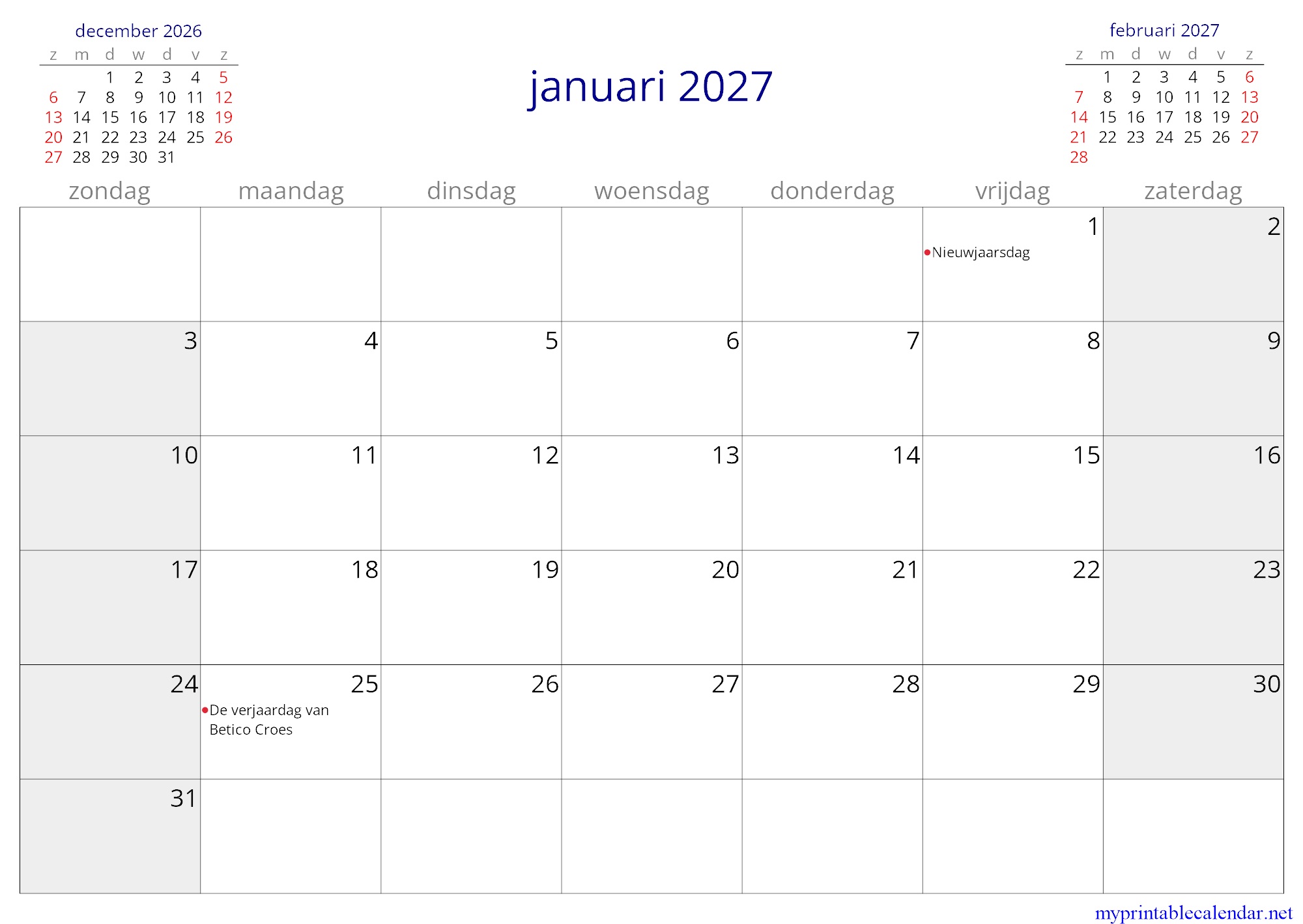 januari 2027 monthly calendar, Aruba, Dutch jpg