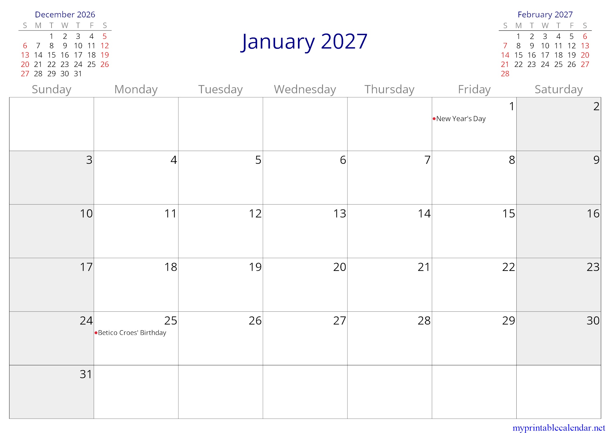 January 2027 monthly calendar, Aruba, in English jpg