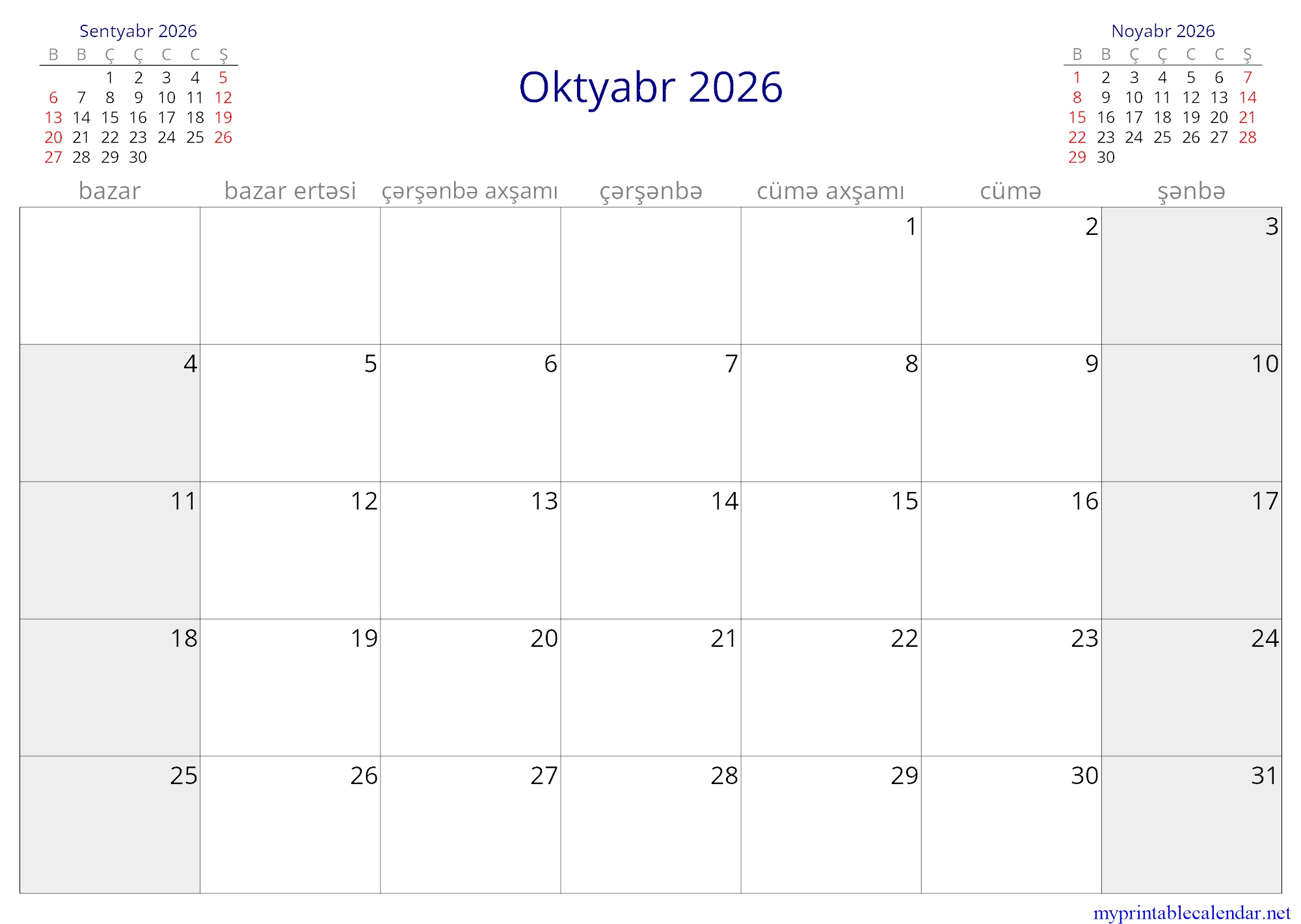 Oktyabr 2026 monthly calendar, Azerbaijan, Azeri (Latin, Azerbaijan) jpg