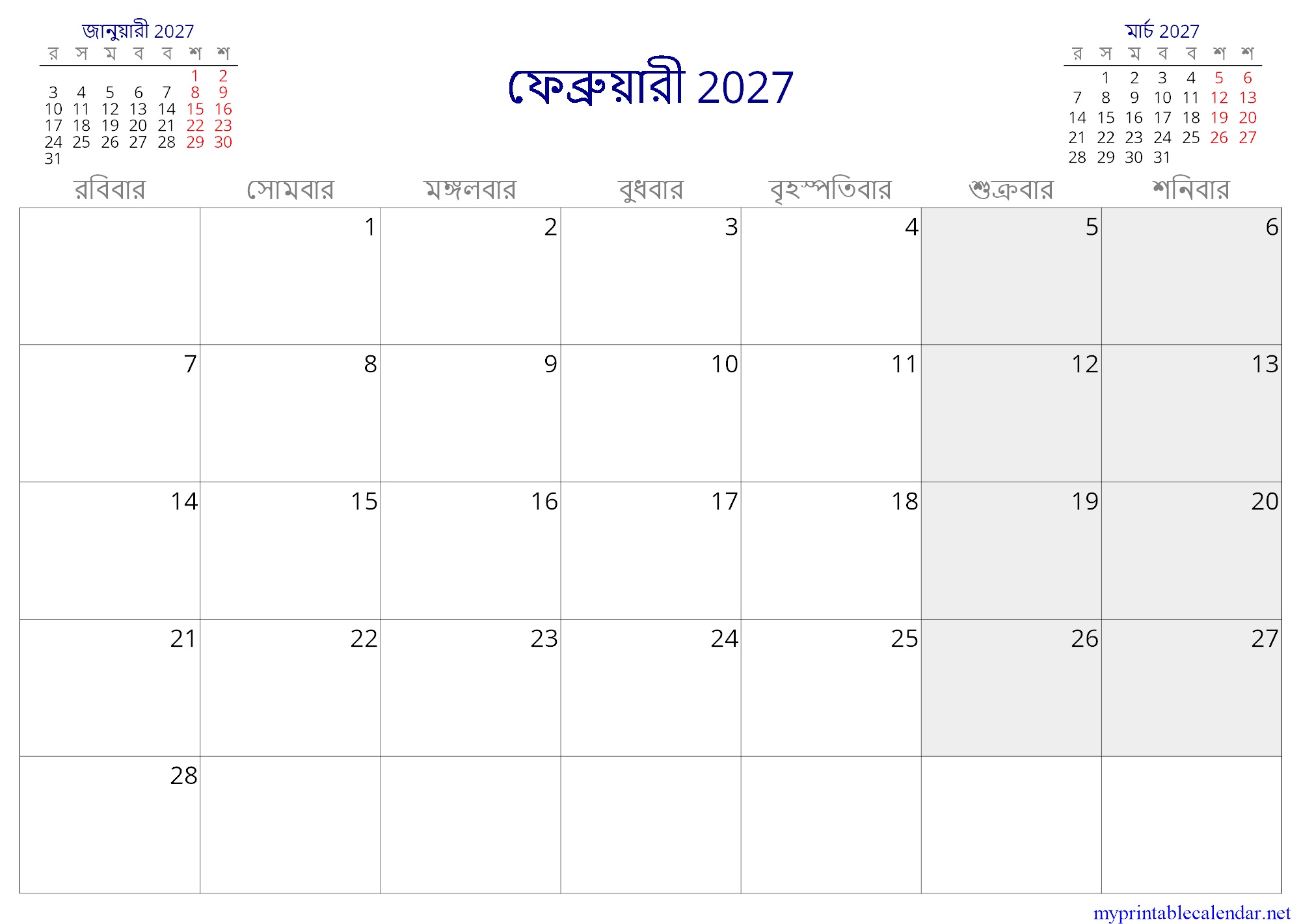 ফেব্রুয়ারী 2027 monthly calendar, Bangladesh, Bengali jpg