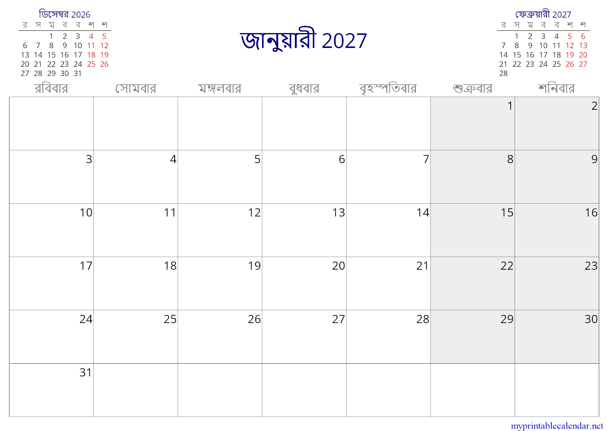 জানুয়ারী 2027 monthly calendar, Bangladesh, Bengali jpg