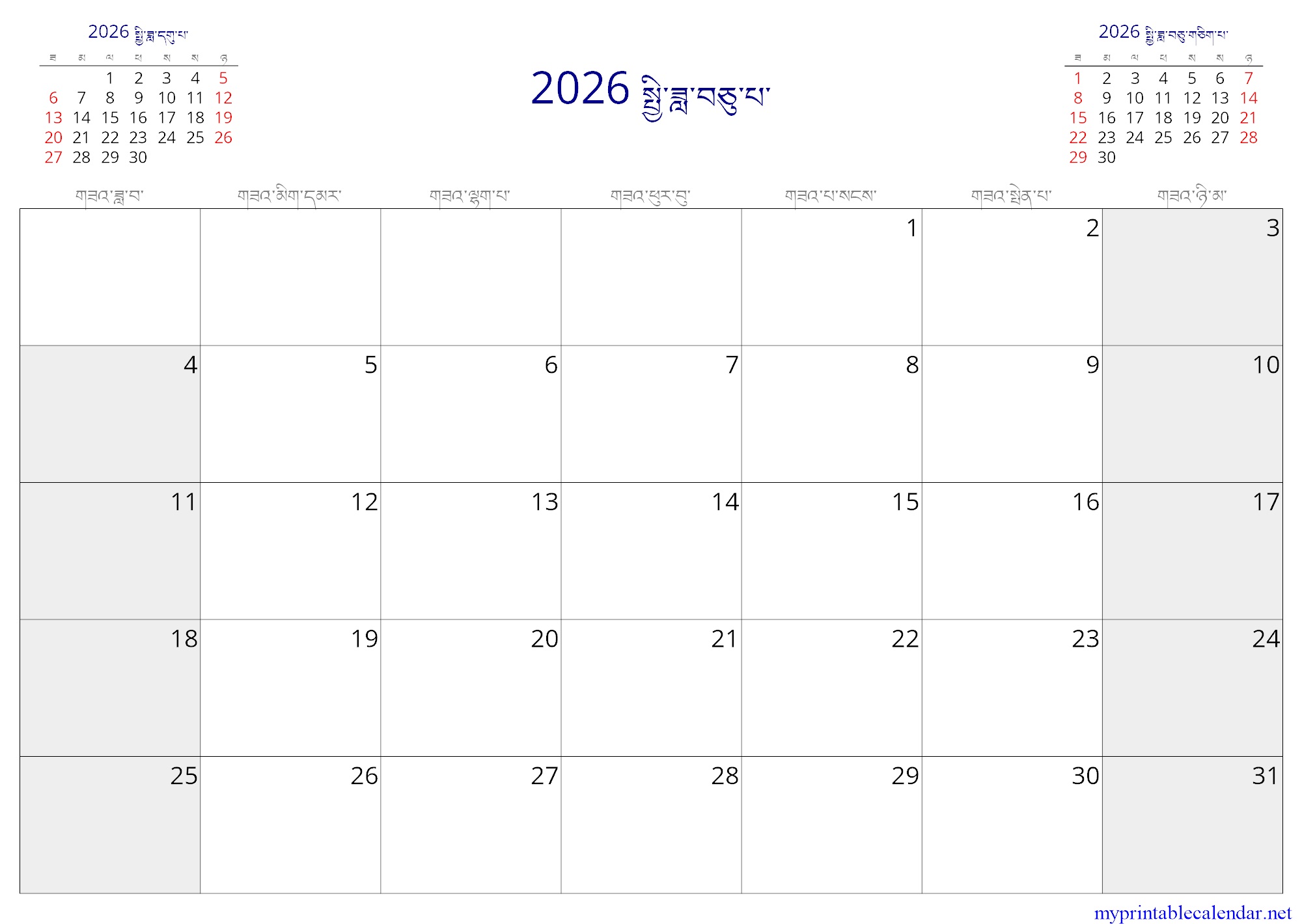 2026 སྤྱི་ཟླ་བཅུ་པ་ monthly calendar, Bhutan, Dzongkha jpg