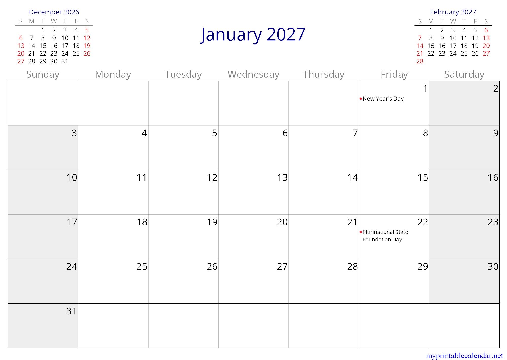 January 2027 monthly calendar, Bolivia, in English jpg