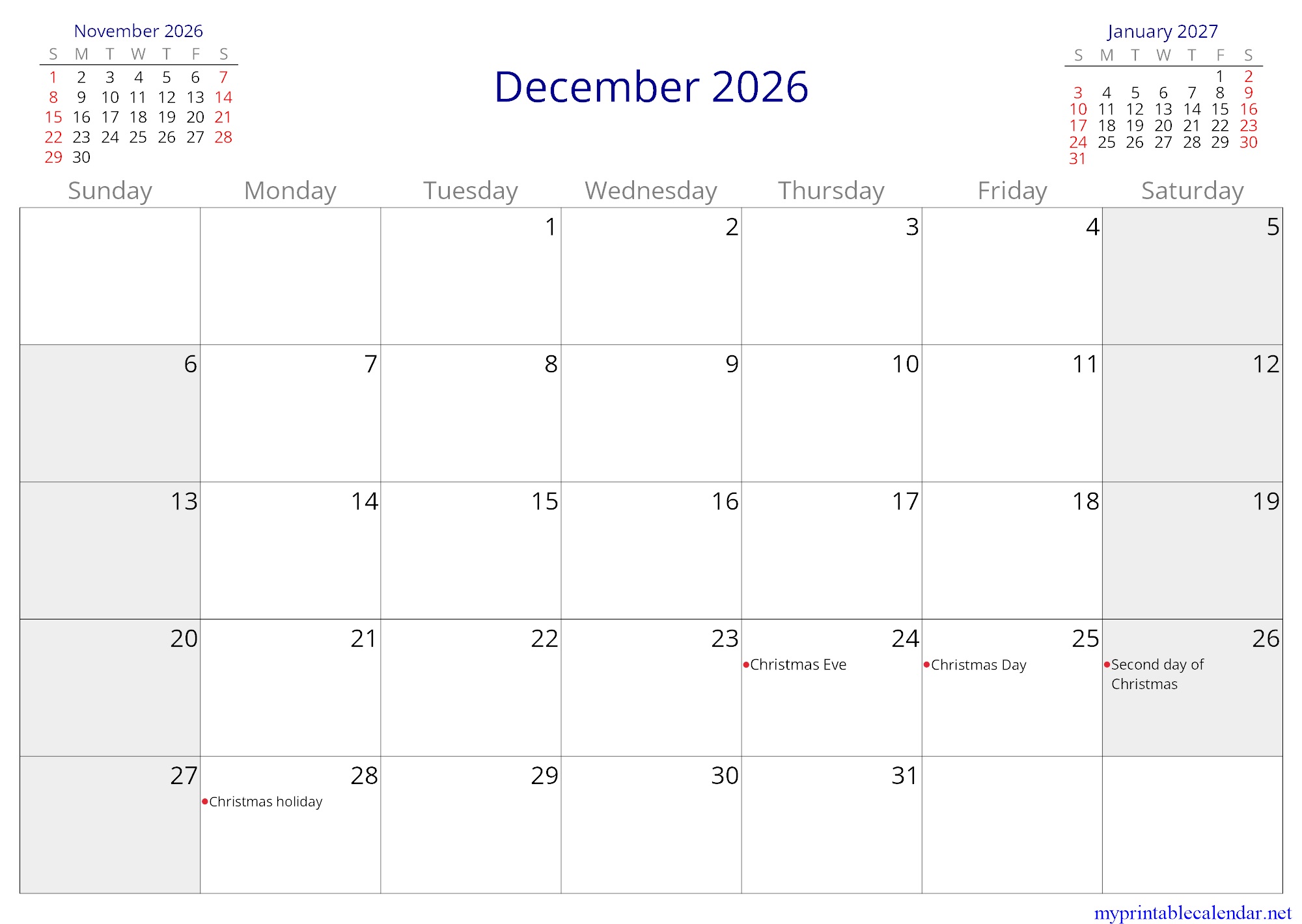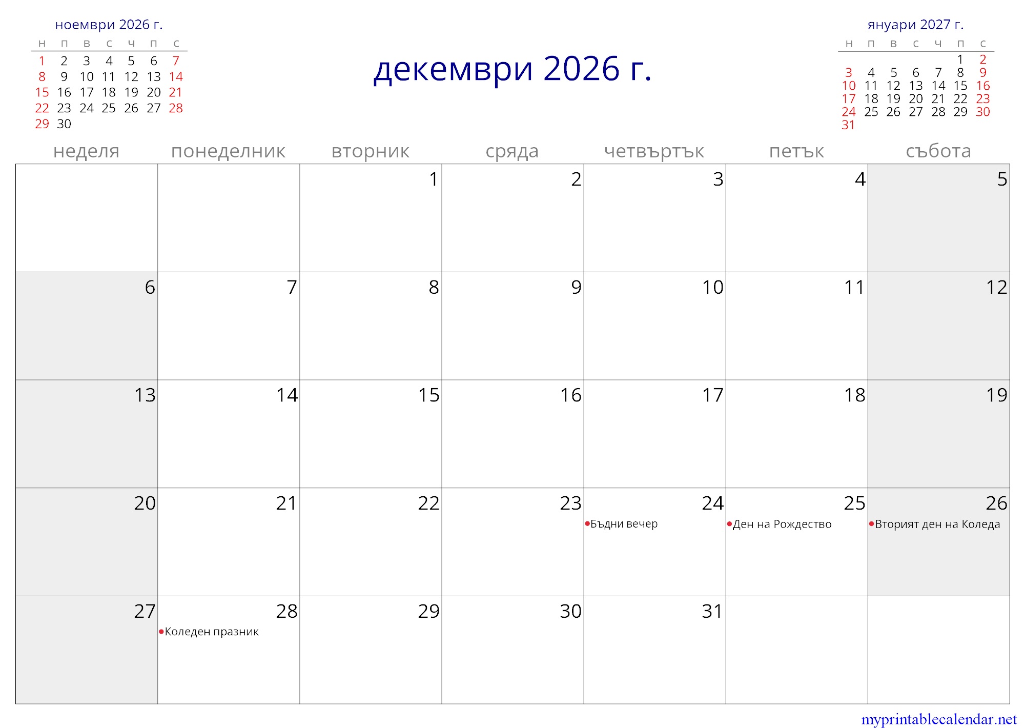 декември 2026 г. monthly calendar, Bulgaria, Bulgarian jpg