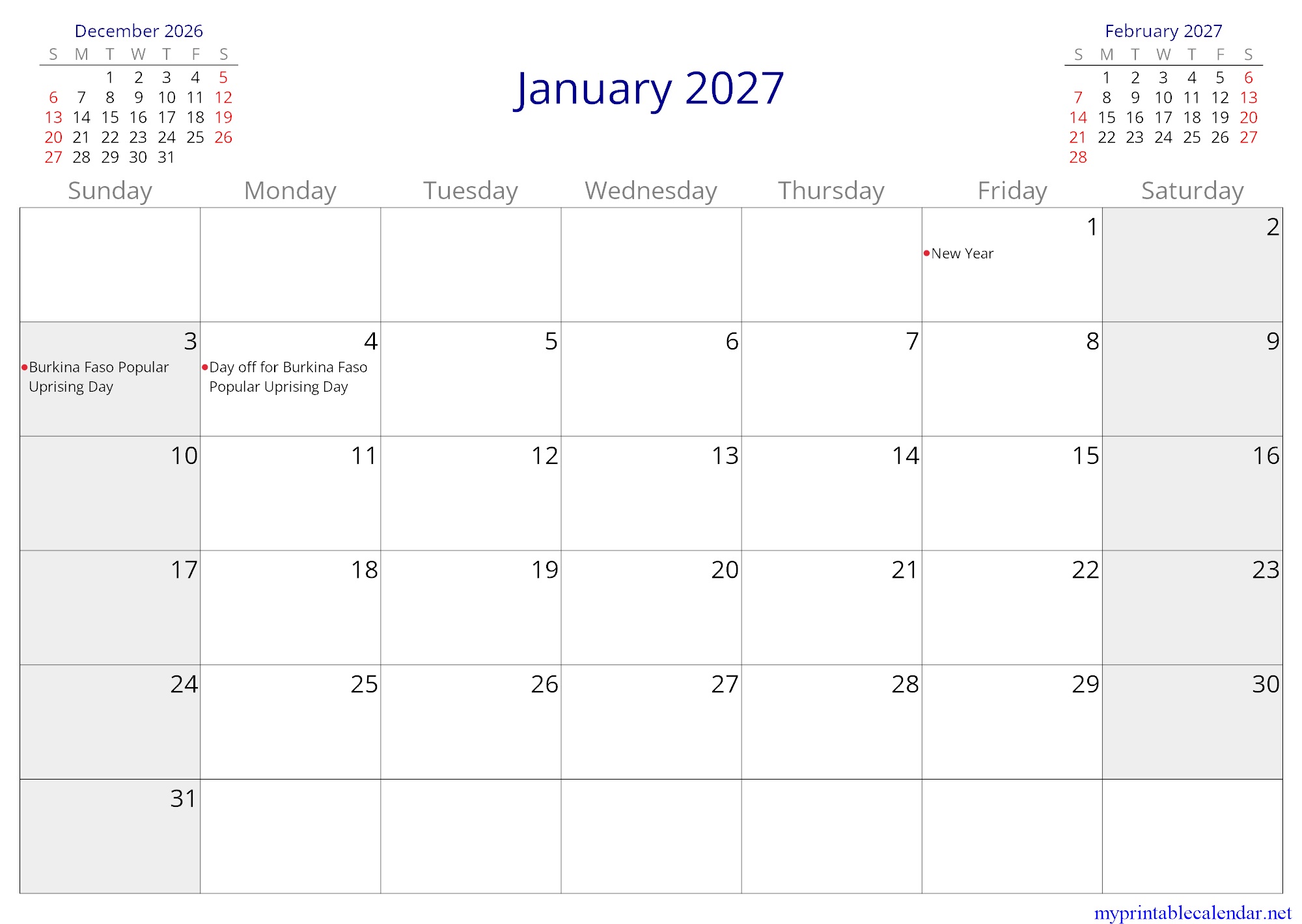 January 2027 monthly calendar, Burkina Faso, in English jpg