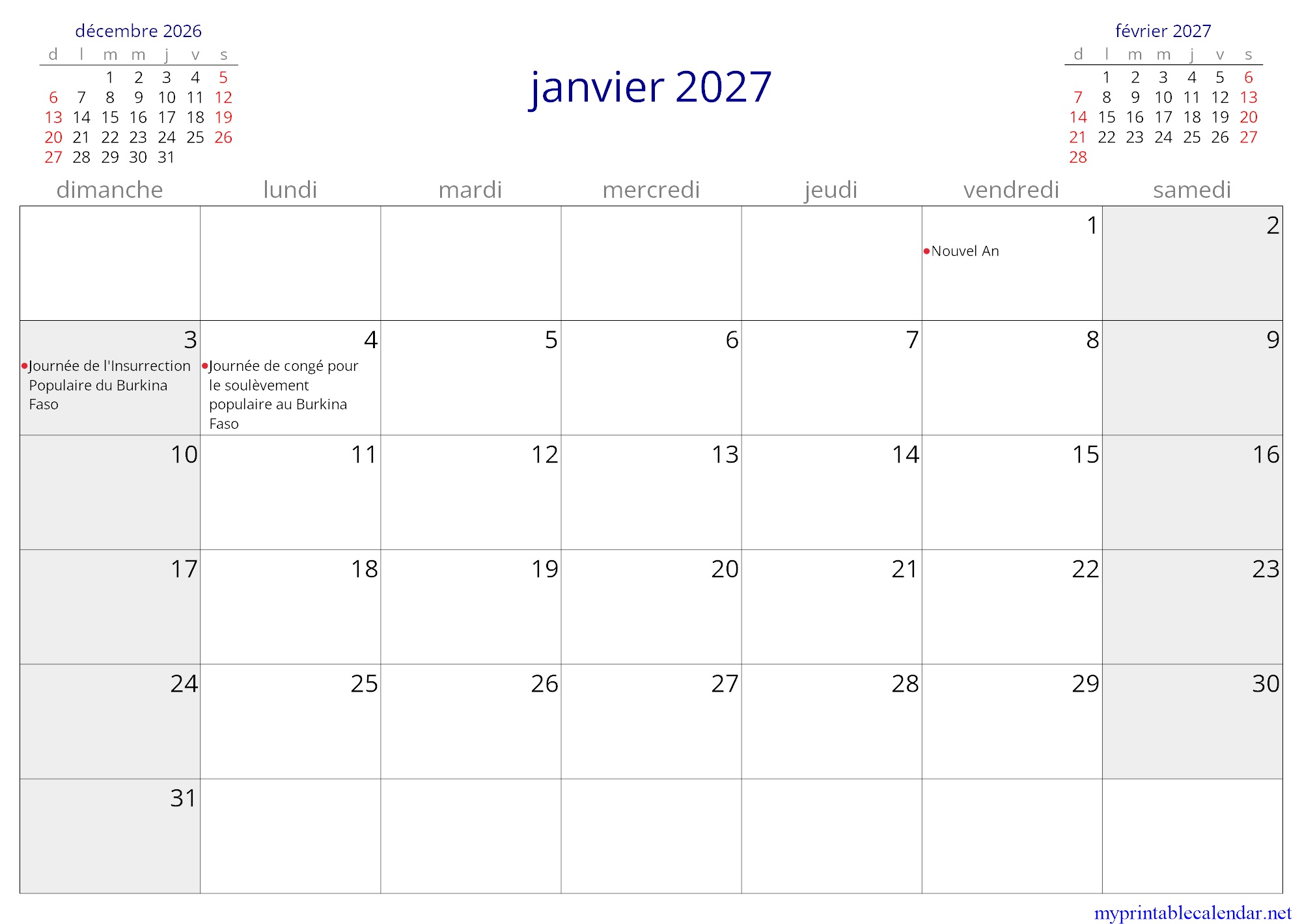 Monthly calendar for 2027, Burkina Faso, French pdf