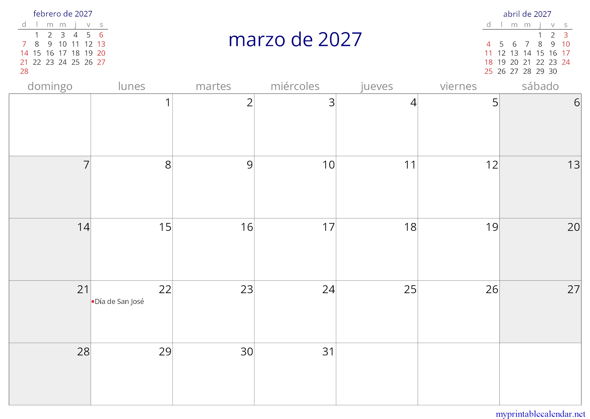 marzo de 2027 monthly calendar, Colombia, Spanish jpg