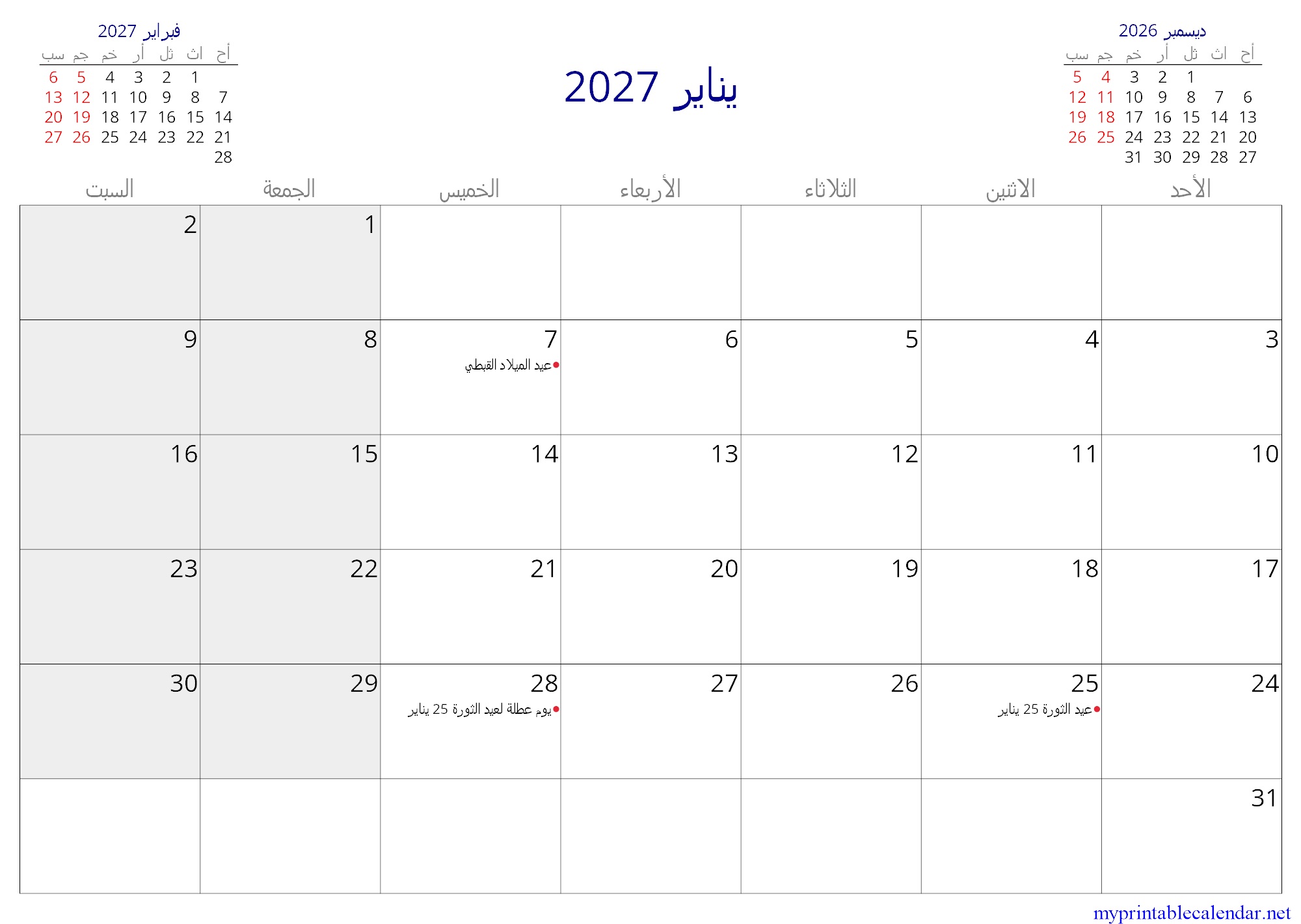 يناير 2027 monthly calendar, Egypt, Arabic jpg