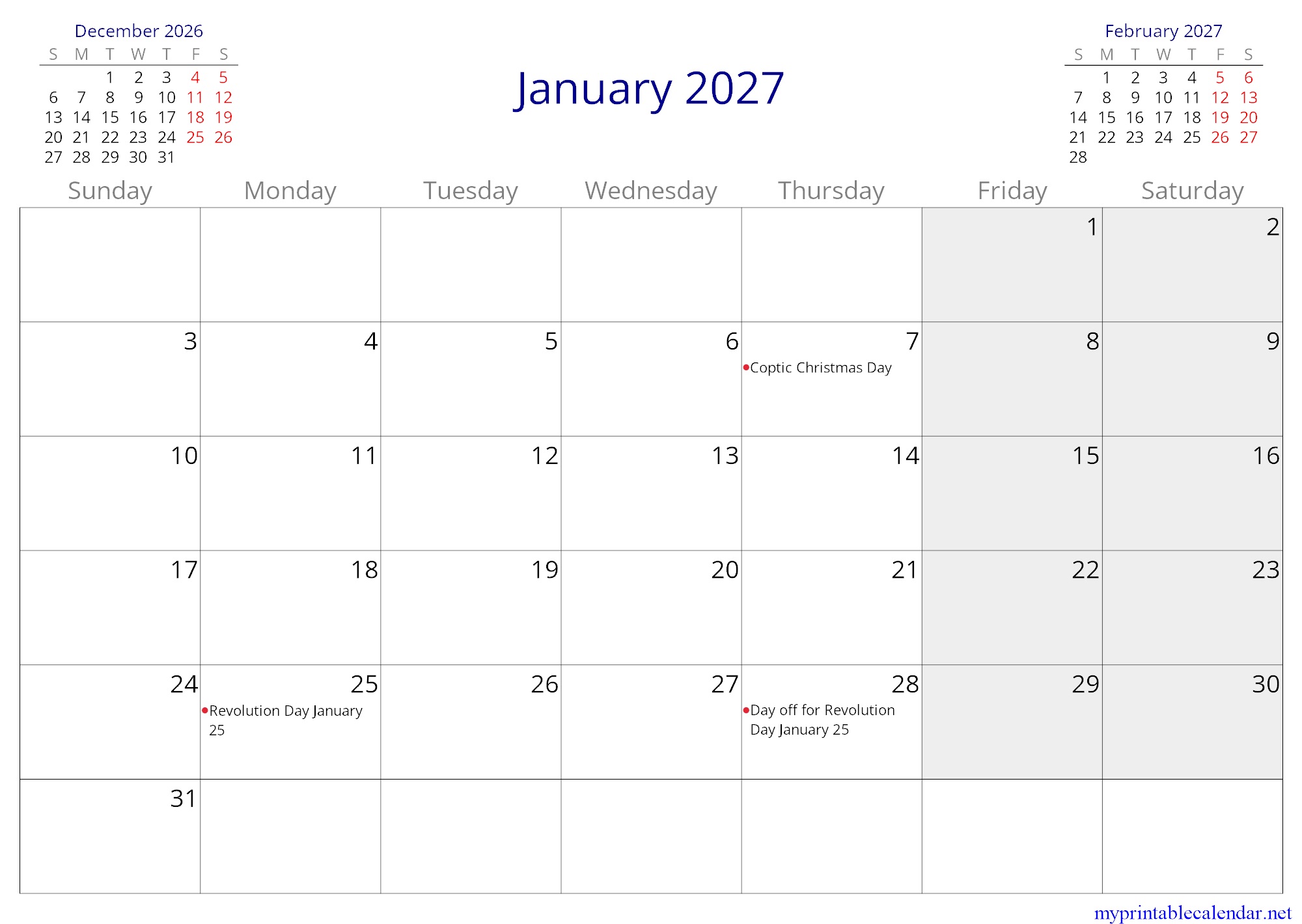 January 2027 monthly calendar, Egypt, in English jpg