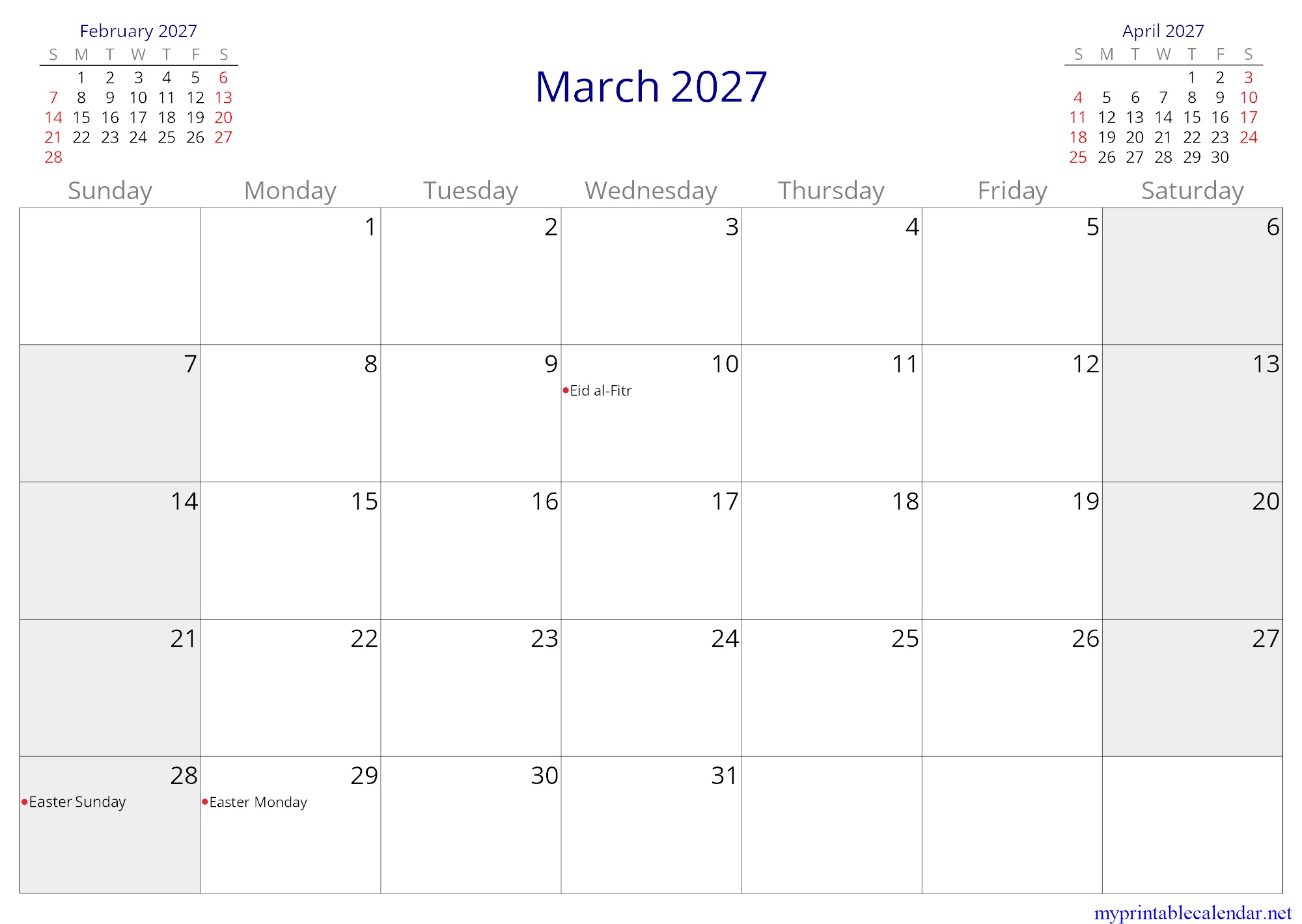 March 2027 monthly calendar, Gabon, in English jpg