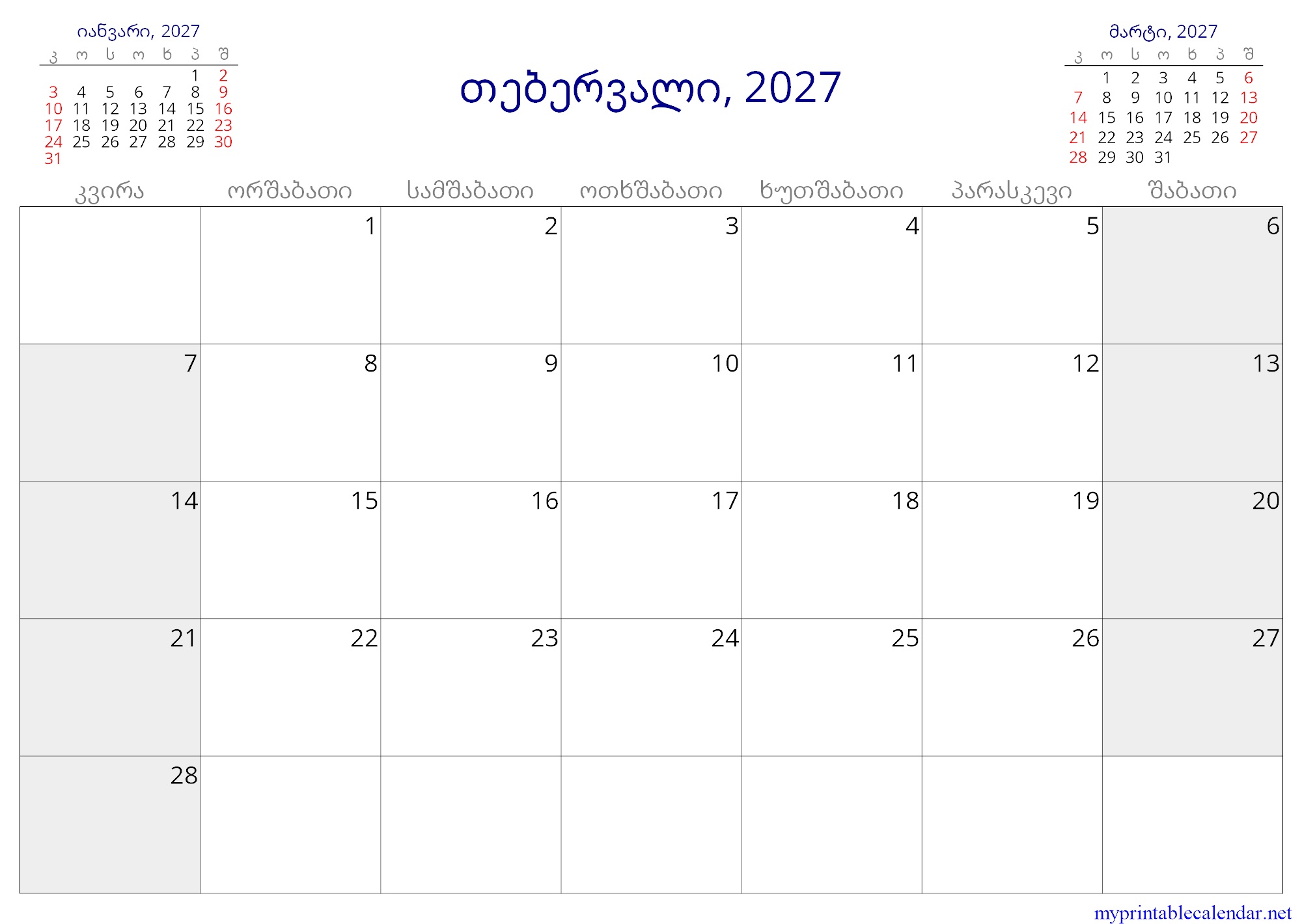 თებერვალი, 2027 monthly calendar, Georgia, Georgian jpg