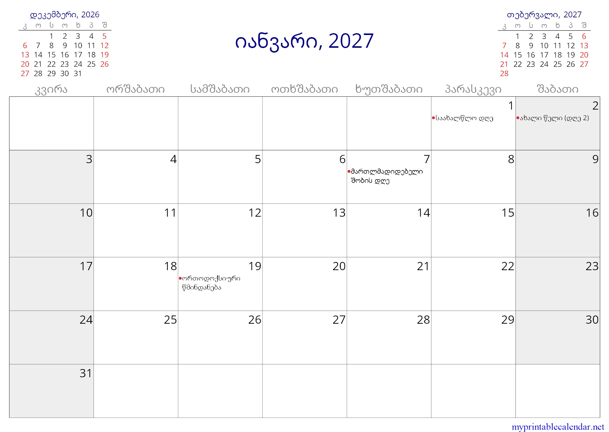 Monthly calendar for 2027, Georgia, Georgian pdf