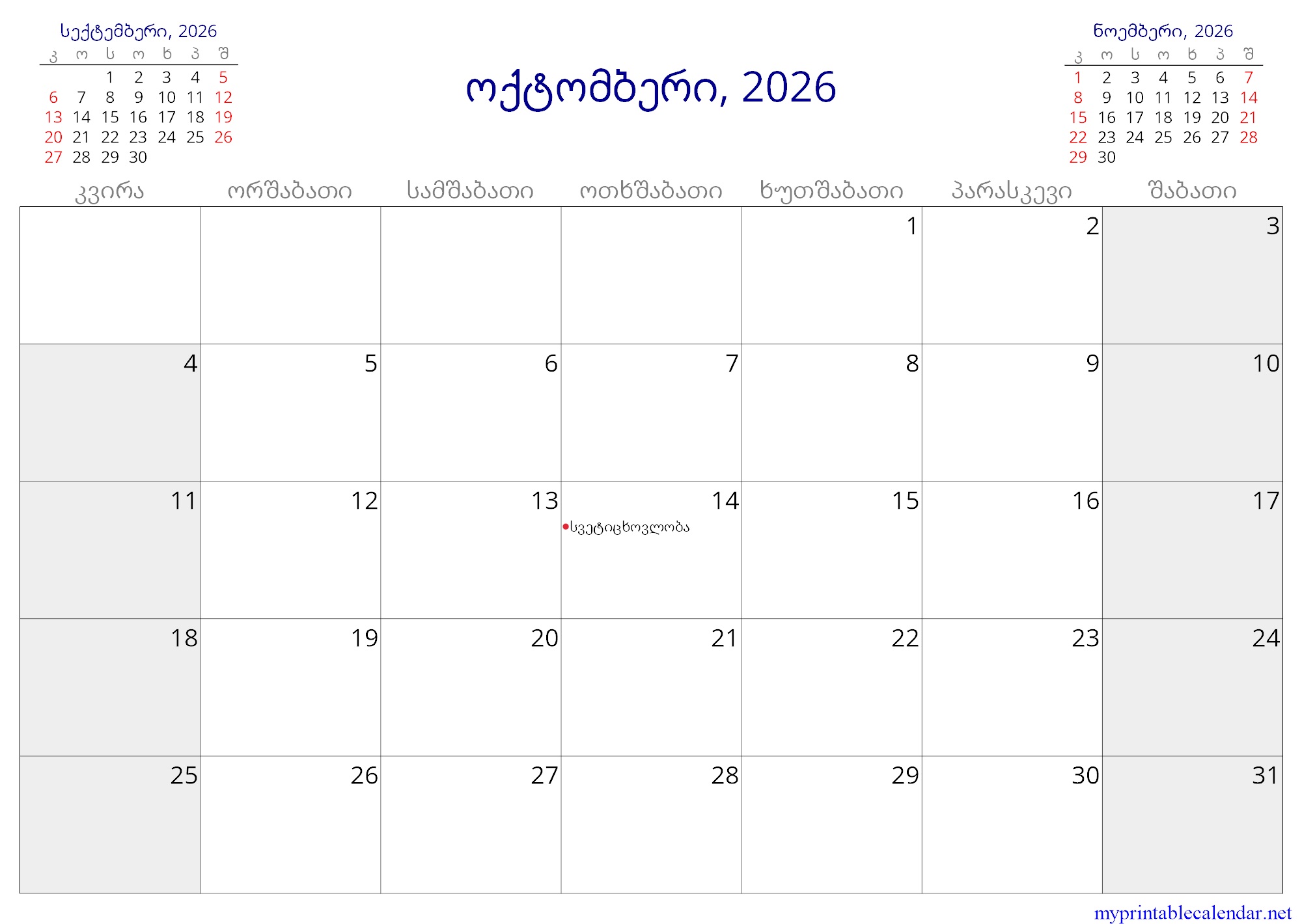 ოქტომბერი, 2026 monthly calendar, Georgia, Georgian jpg