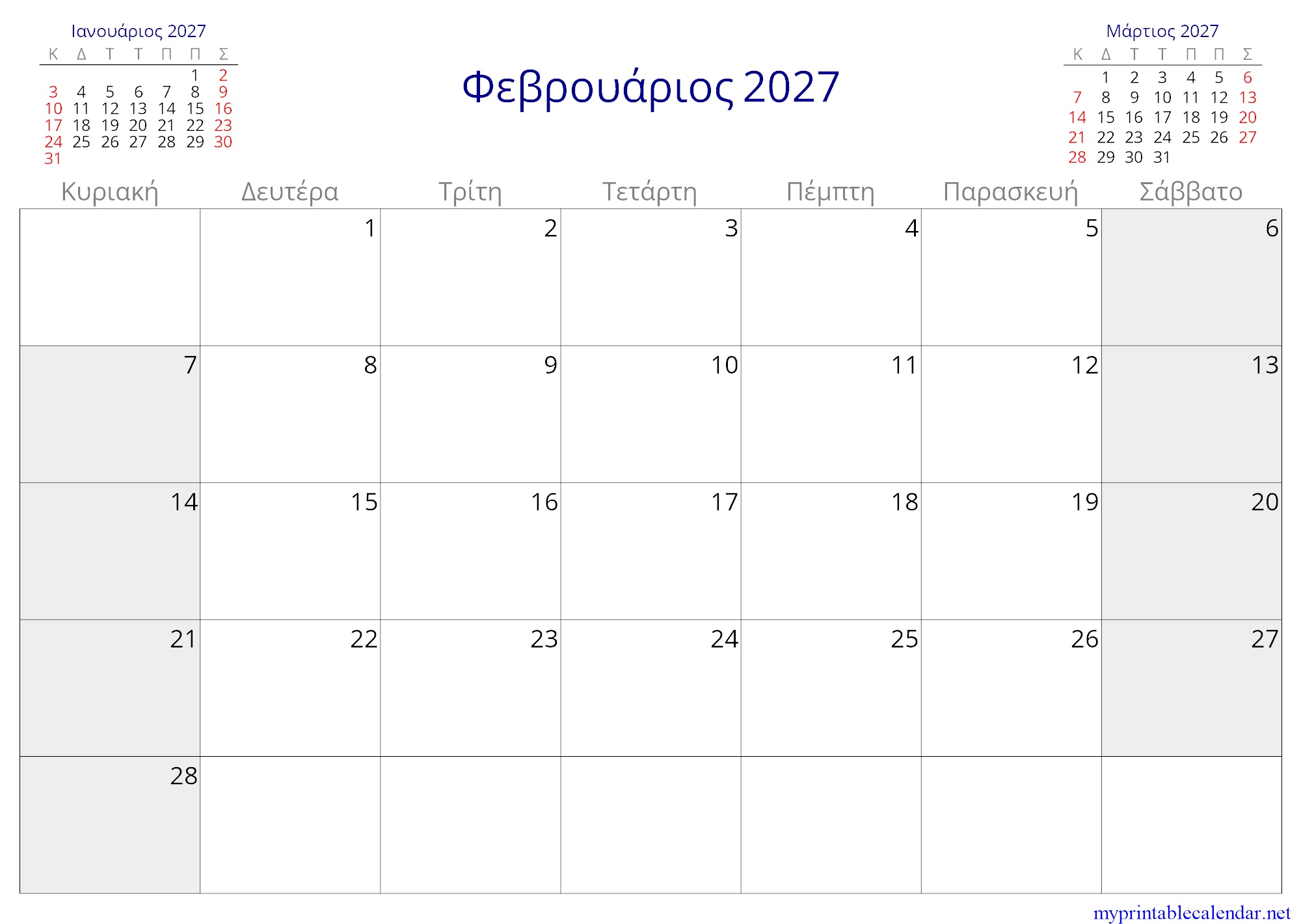 Φεβρουάριος 2027 monthly calendar, Greece, Greek jpg