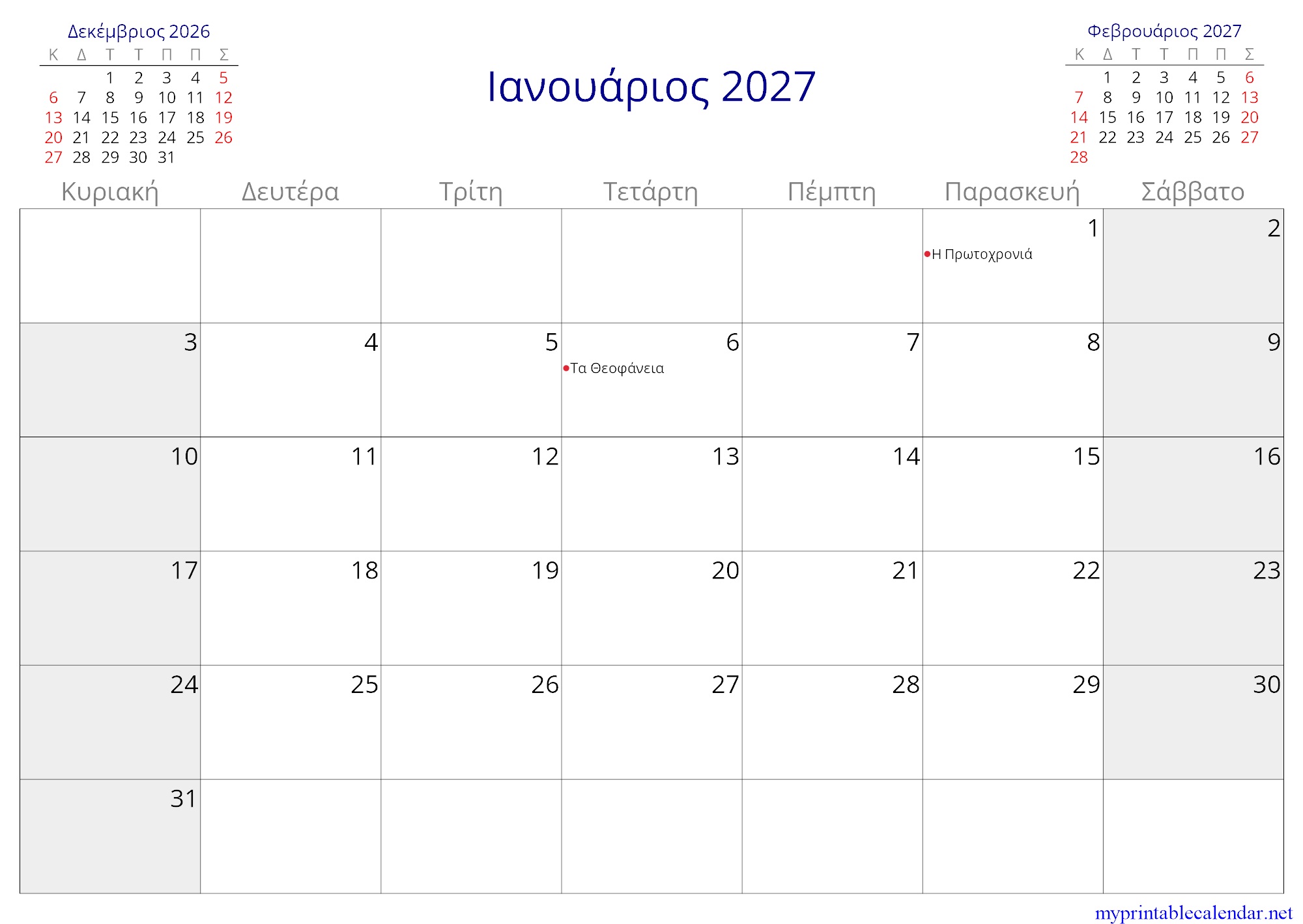 Ιανουάριος 2027 monthly calendar, Greece, Greek jpg