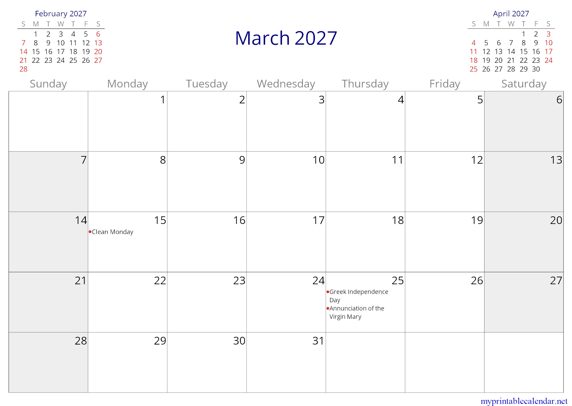 March 2027 monthly calendar, Greece, in English jpg
