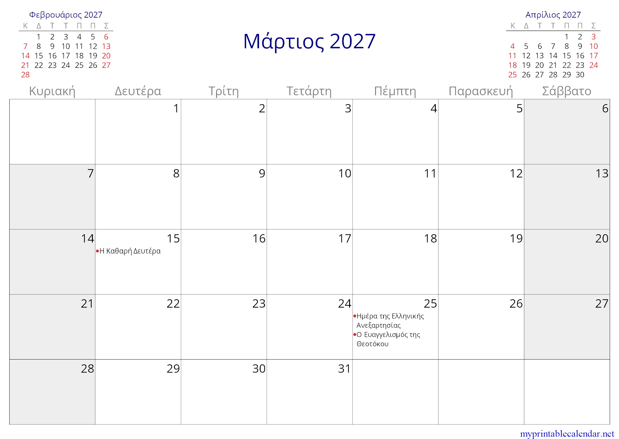 Μάρτιος 2027 monthly calendar, Greece, Greek jpg