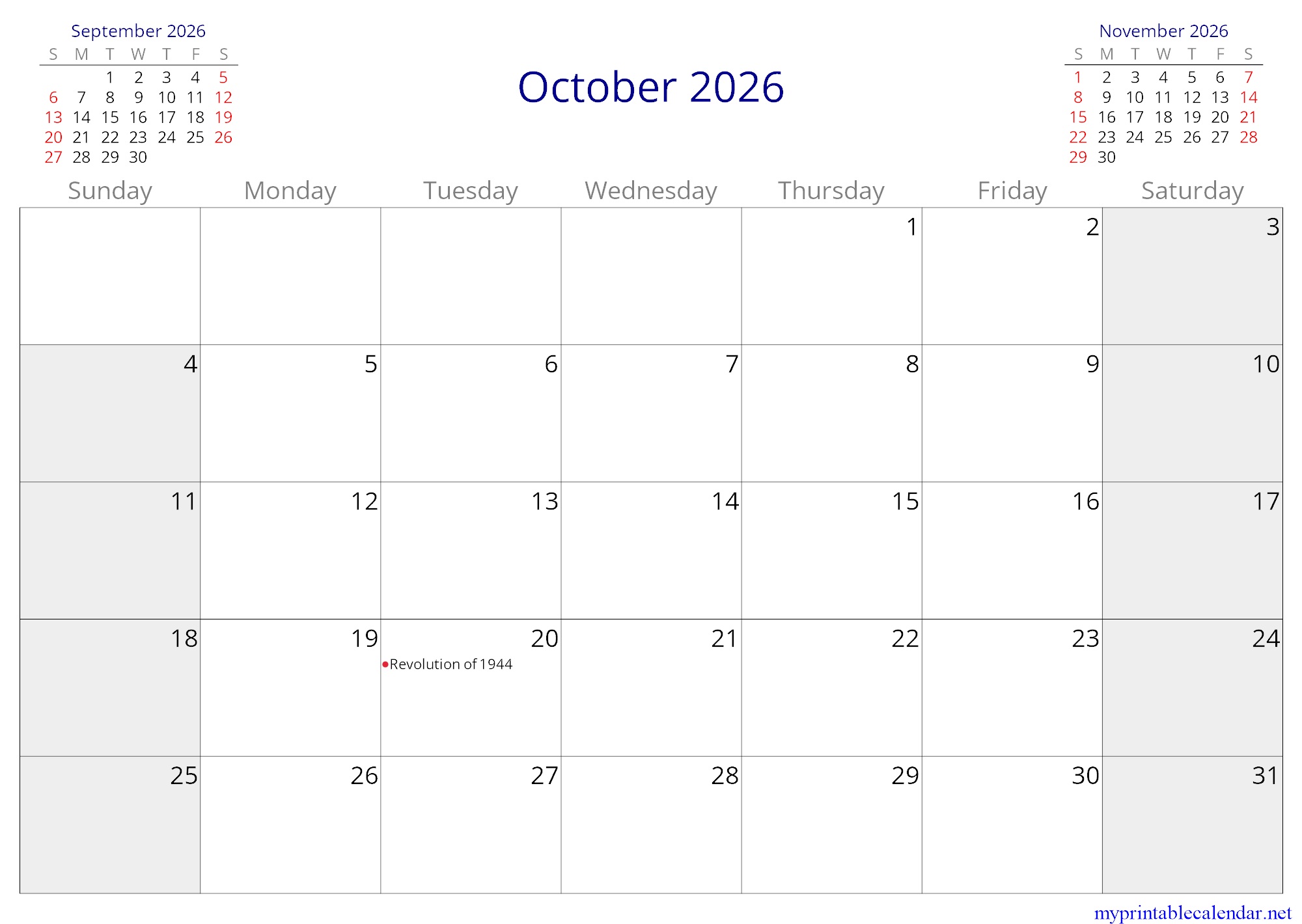 octubre de 2026 monthly calendar, Guatemala, Spanish jpg