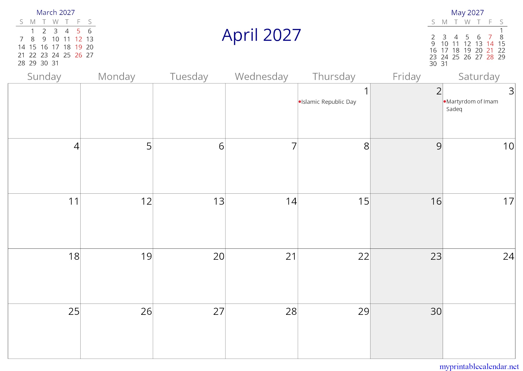 April 2027 monthly calendar, Iran, in English jpg