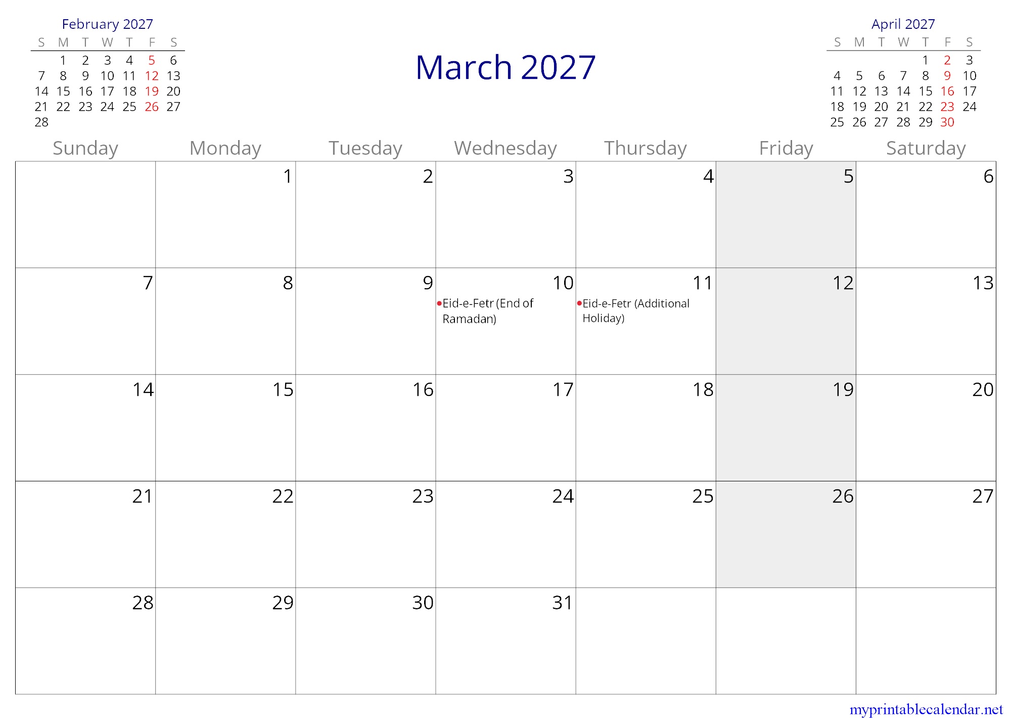 March 2027 monthly calendar, Iran, in English jpg