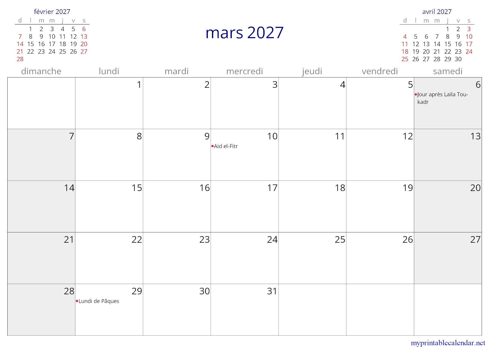 mars 2027 monthly calendar, Ivory Coast, French jpg