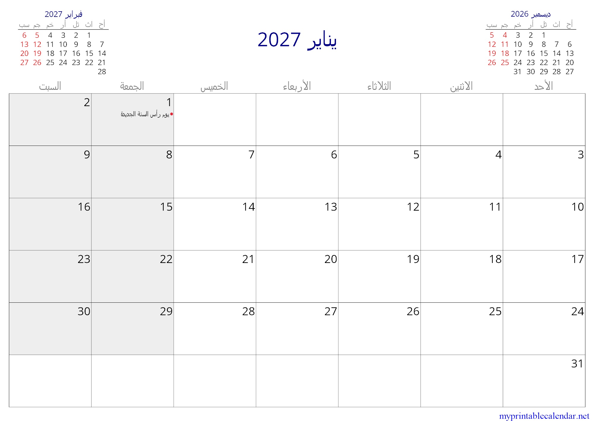 يناير 2027 monthly calendar, Jordan, Arabic jpg