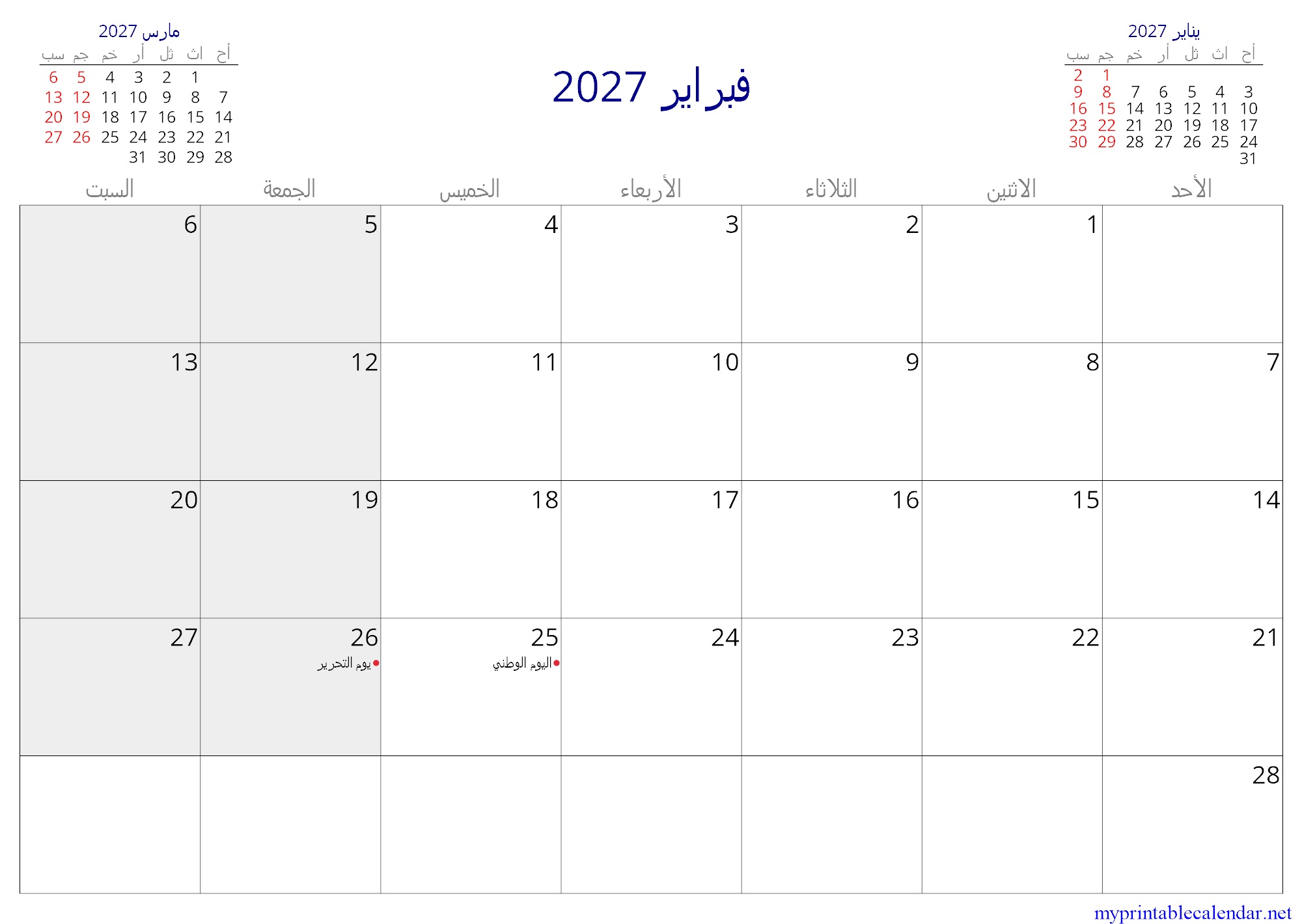 فبراير 2027 monthly calendar, Kuwait, Arabic jpg