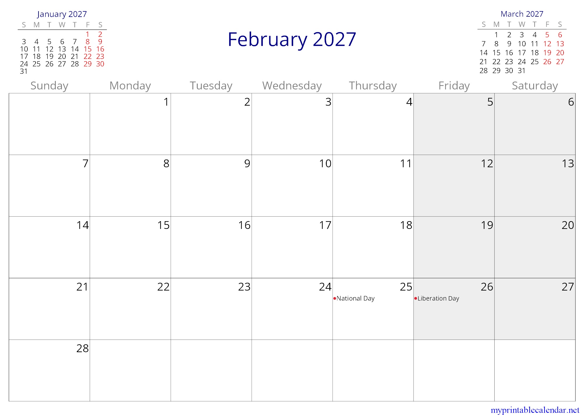 February 2027 monthly calendar, Kuwait, in English jpg