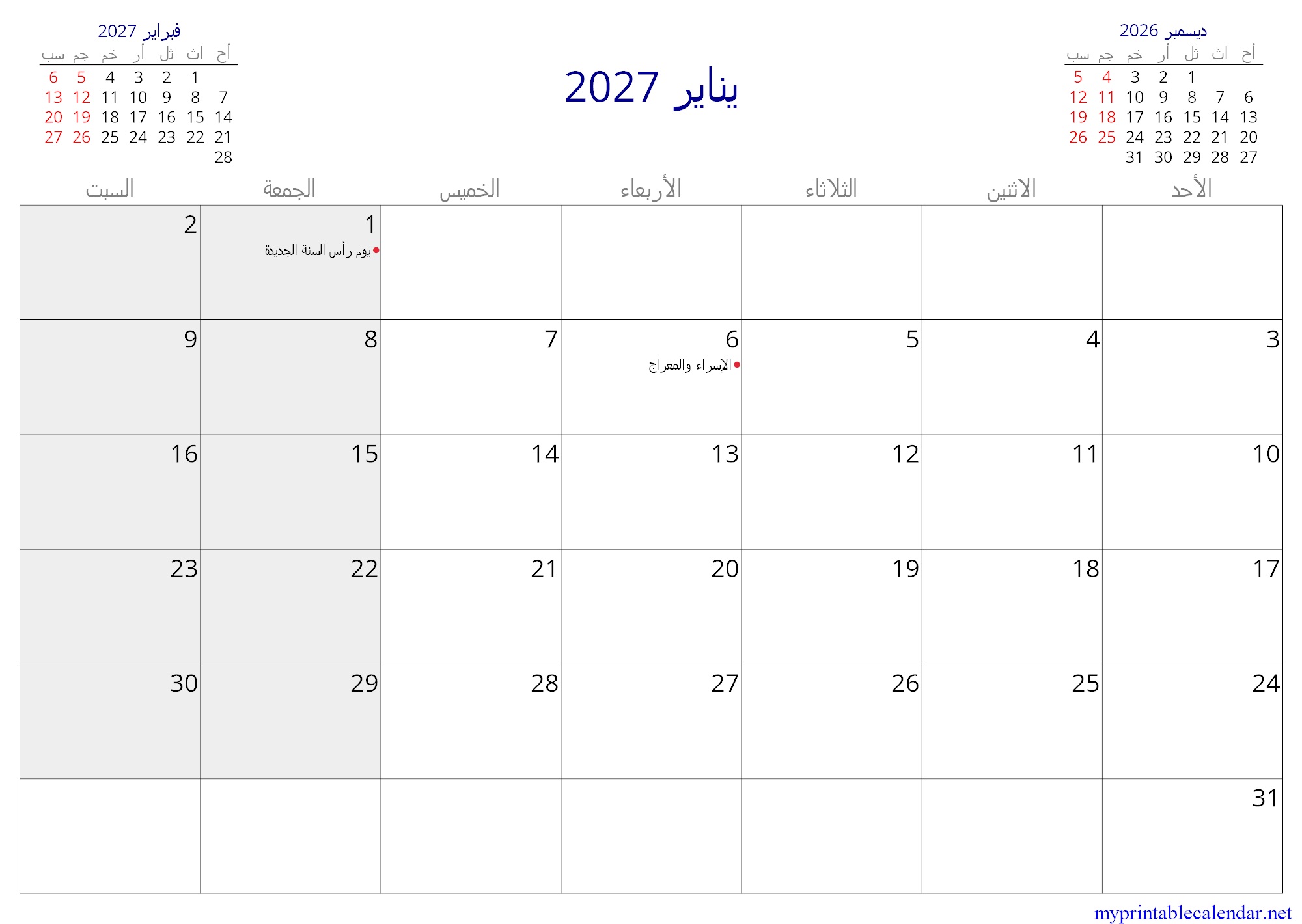 يناير 2027 monthly calendar, Kuwait, Arabic jpg