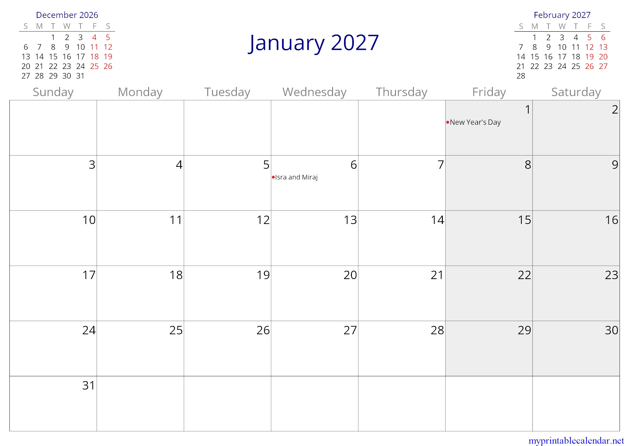 January 2027 monthly calendar, Kuwait, in English jpg