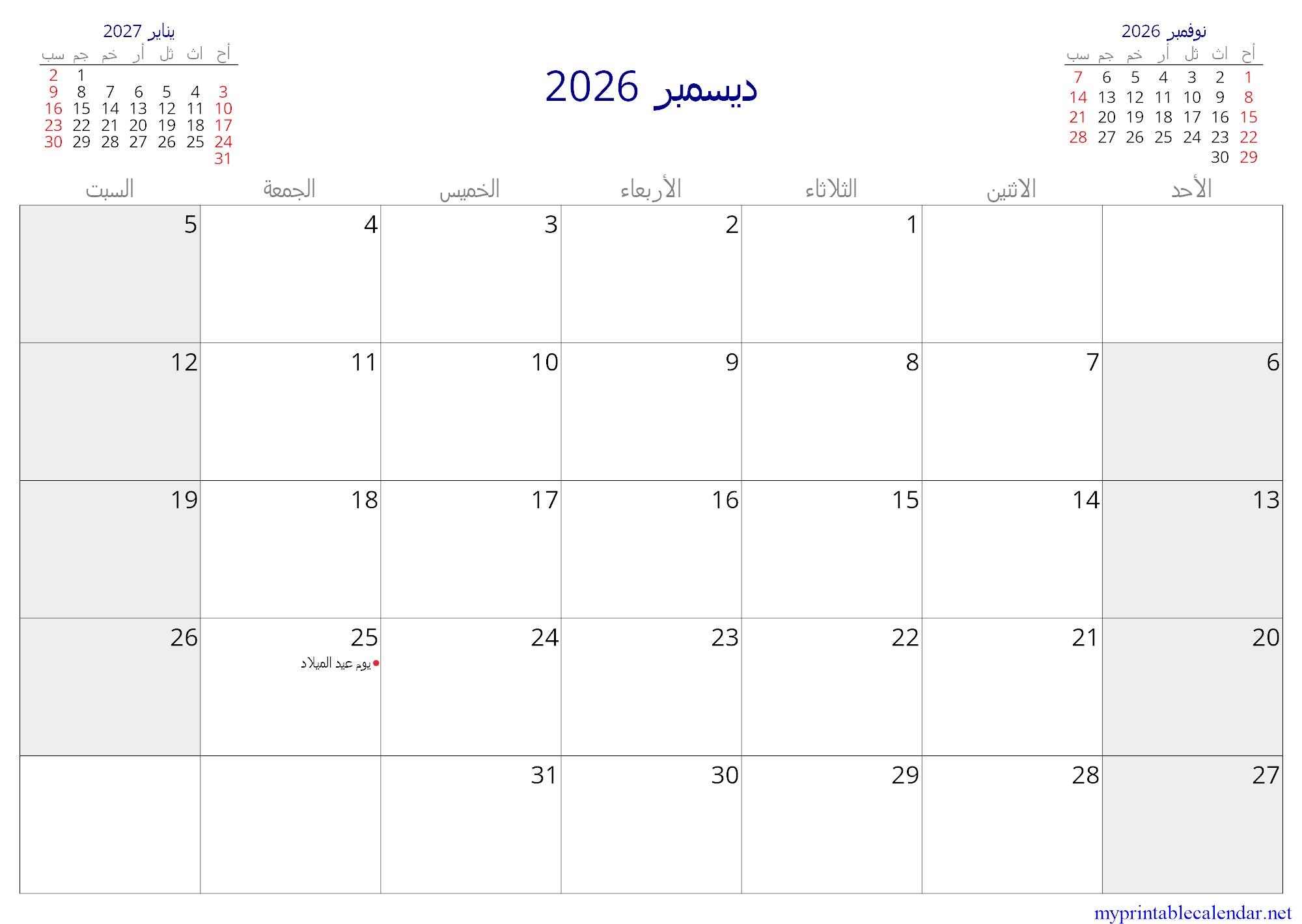 ديسمبر 2026 monthly calendar, Lebanon, Arabic jpg