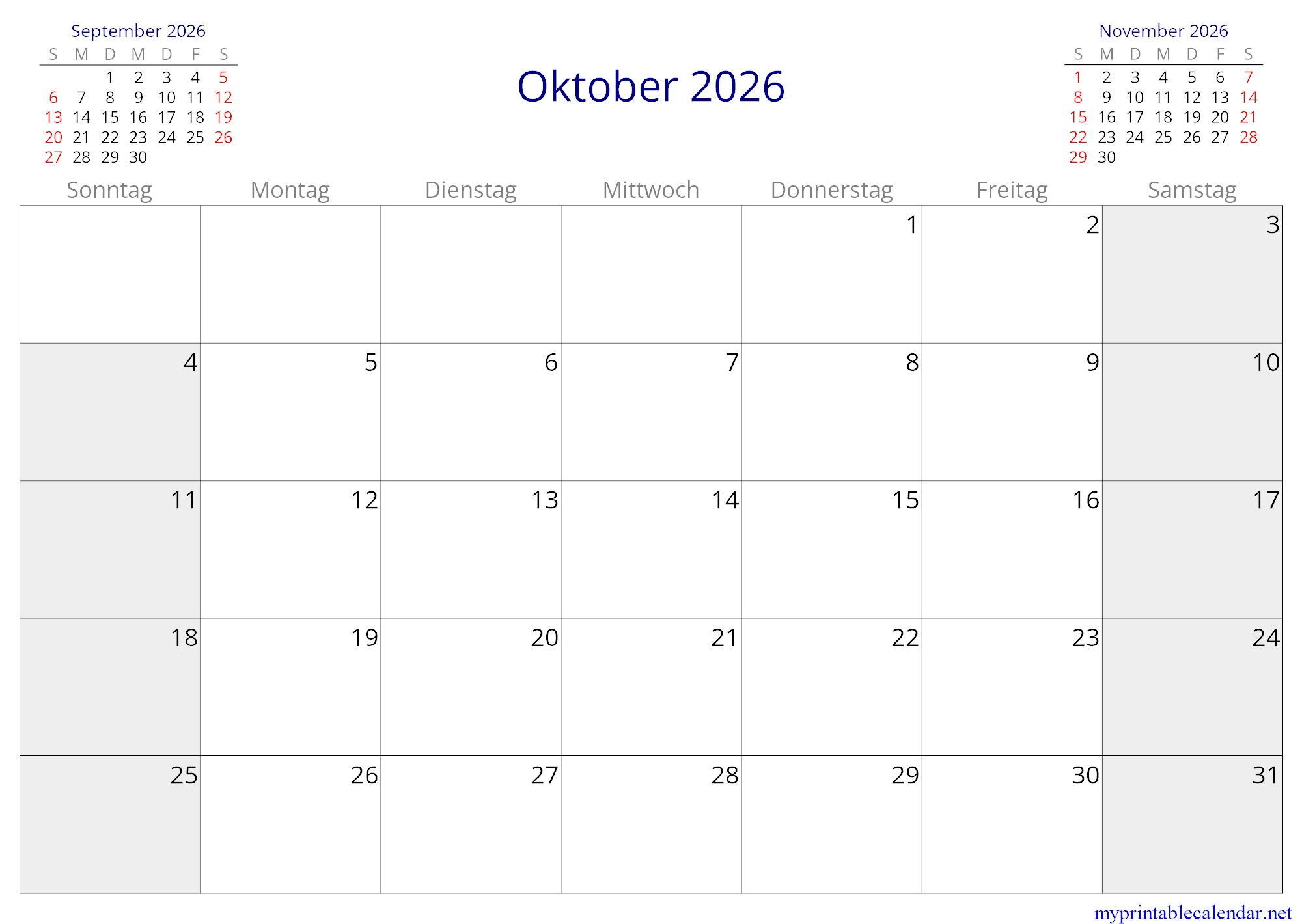 Oktober 2026 monthly calendar, Liechtenstein, German jpg