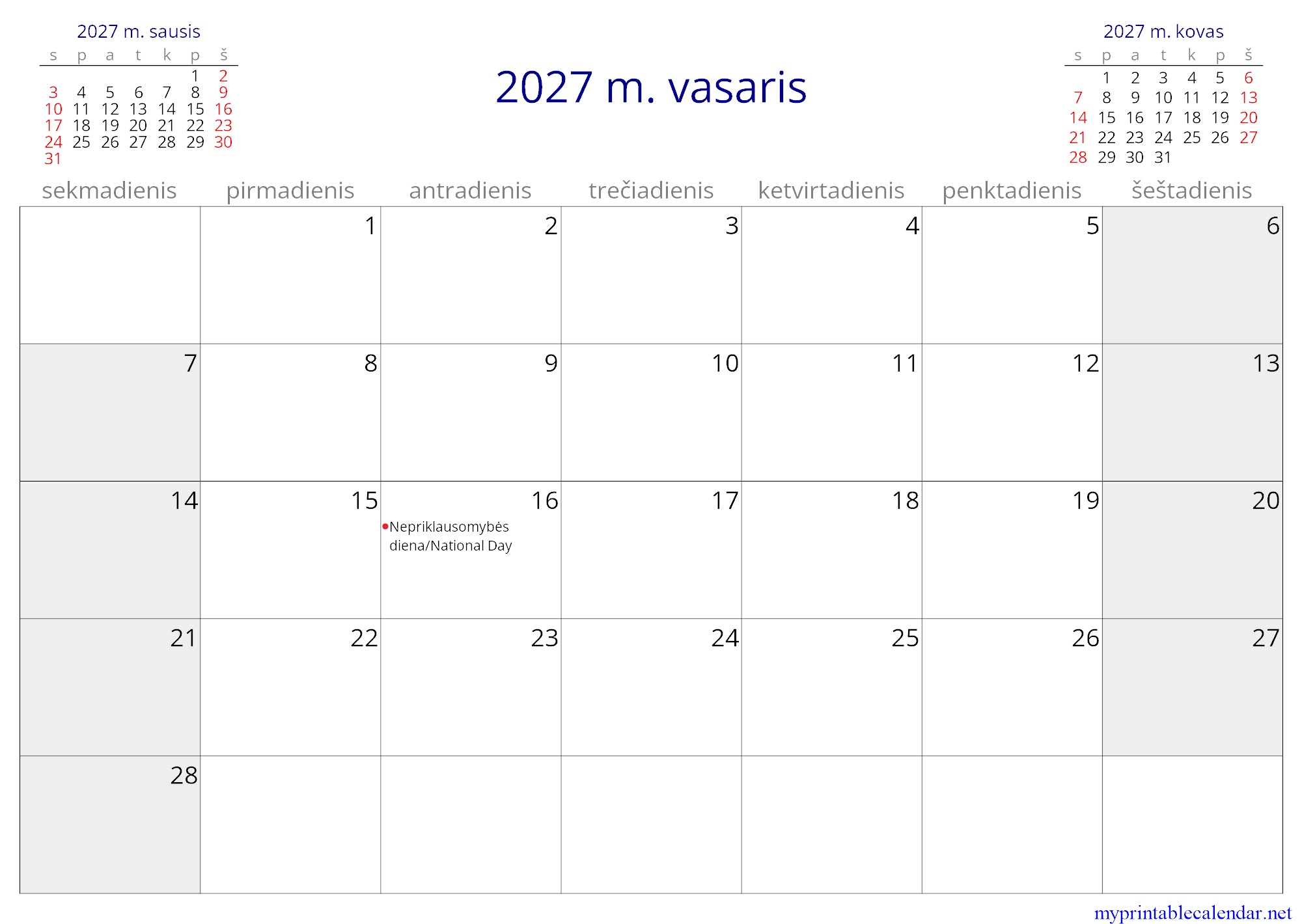 2027 m. vasaris monthly calendar, Lithuania, Lithuanian jpg