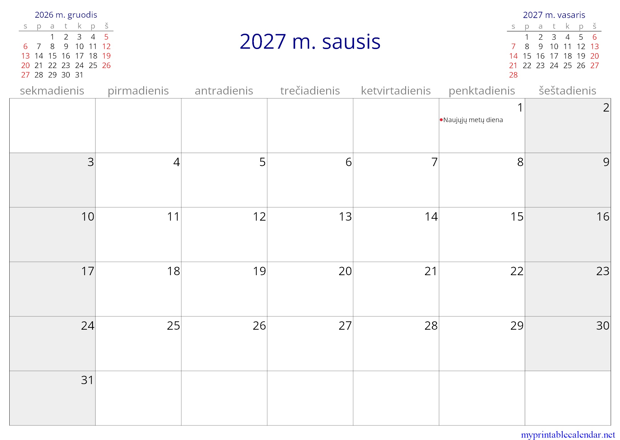 2027 m. sausis monthly calendar, Lithuania, Lithuanian jpg