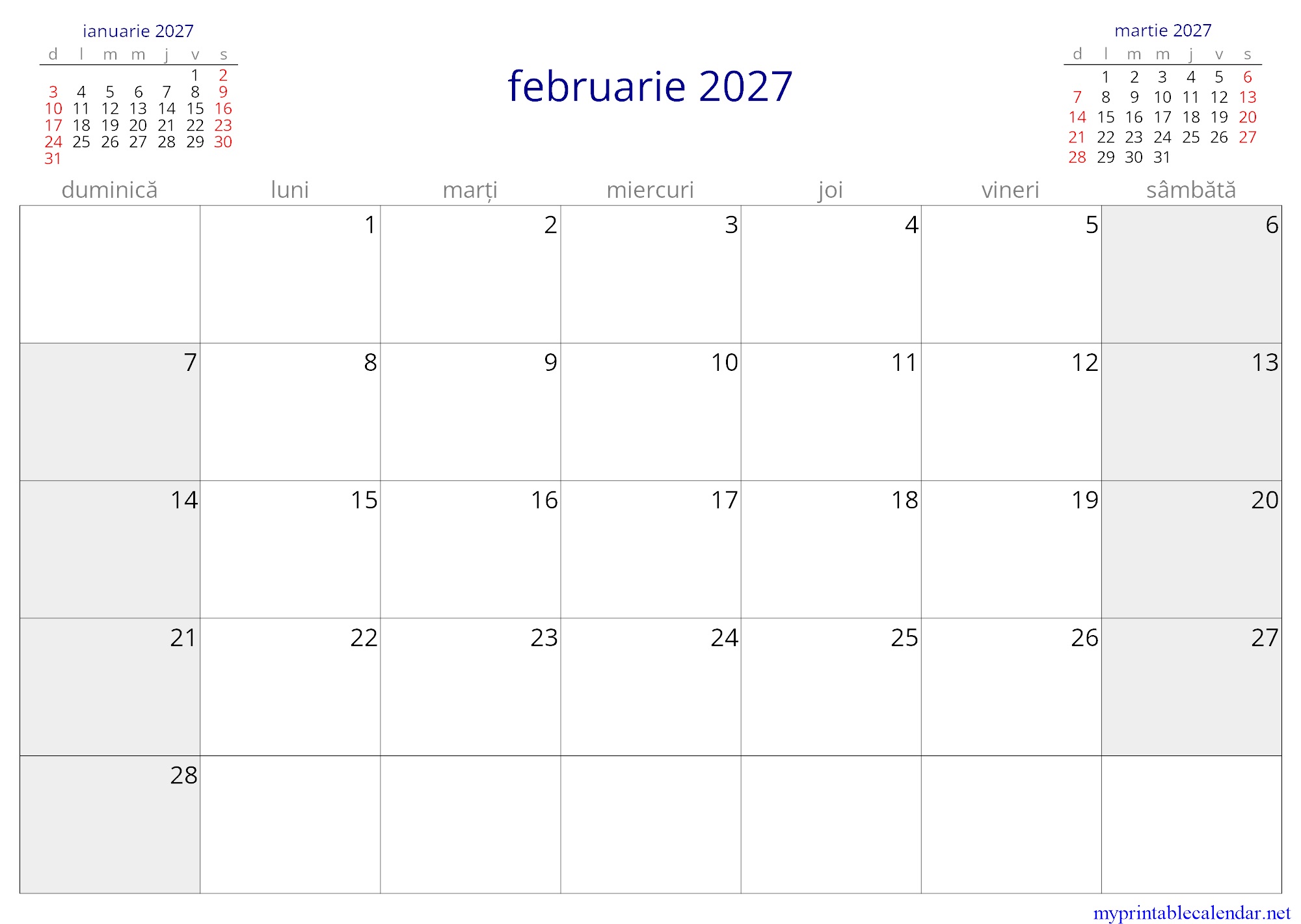 februarie 2027 monthly calendar, Moldova, Romanian jpg