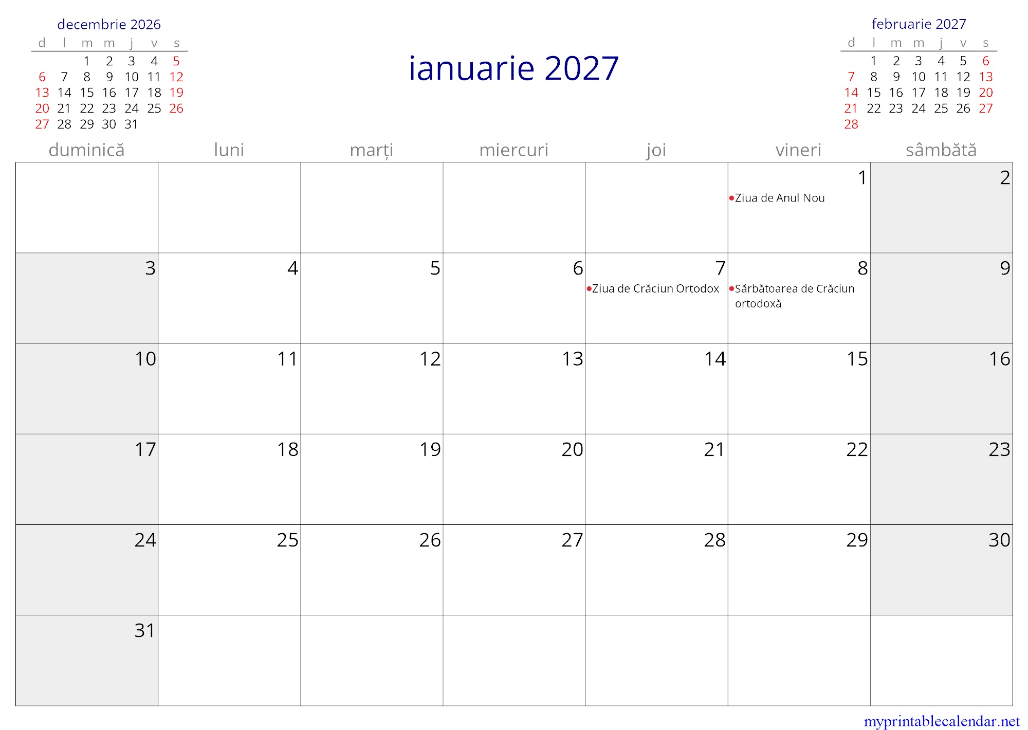 ianuarie 2027 monthly calendar, Moldova, Romanian jpg