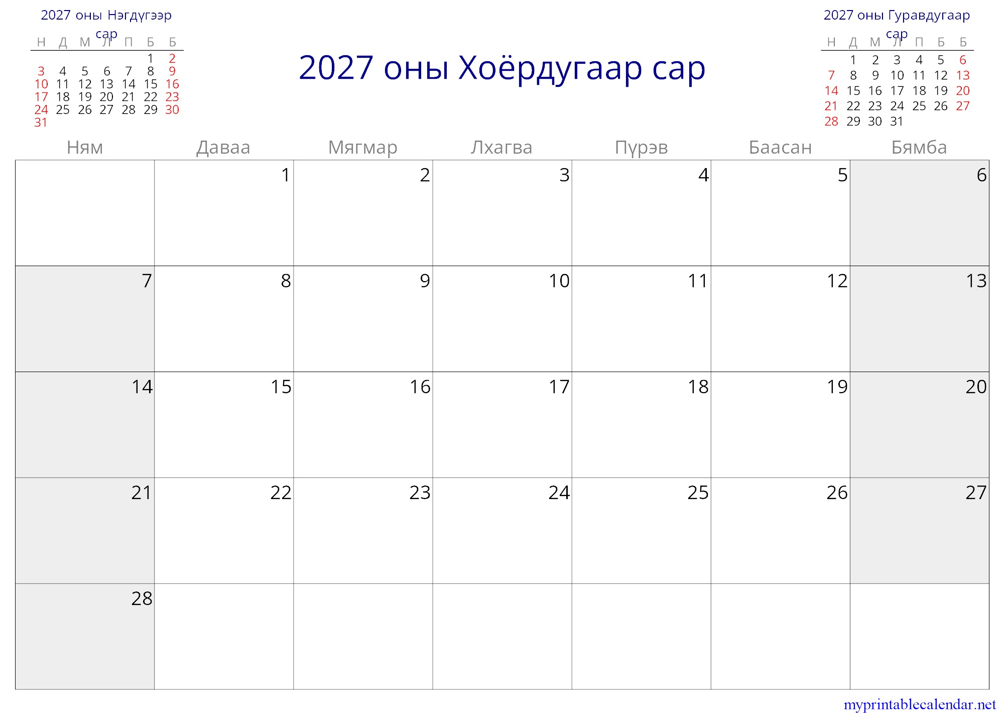Monthly calendar for 2027, Mongolia, Mongolian pdf