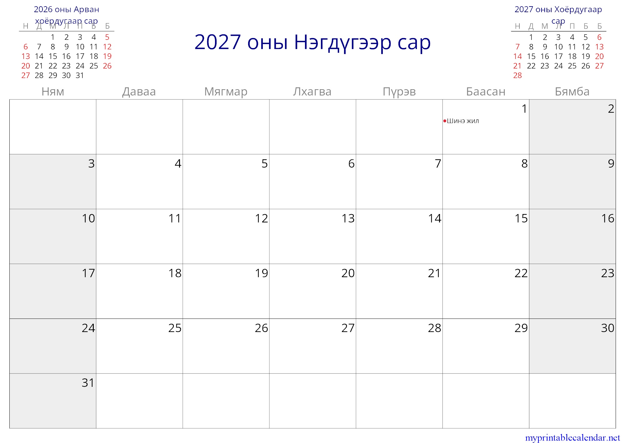 2027 оны Нэгдүгээр сар monthly calendar, Mongolia, Mongolian jpg