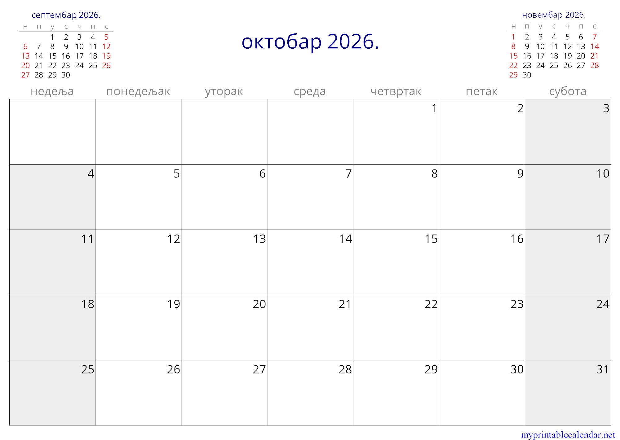 октобар 2026. monthly calendar, Montenegro, Serbian jpg