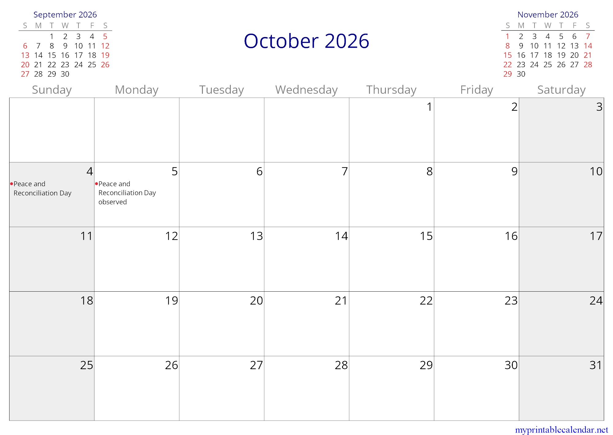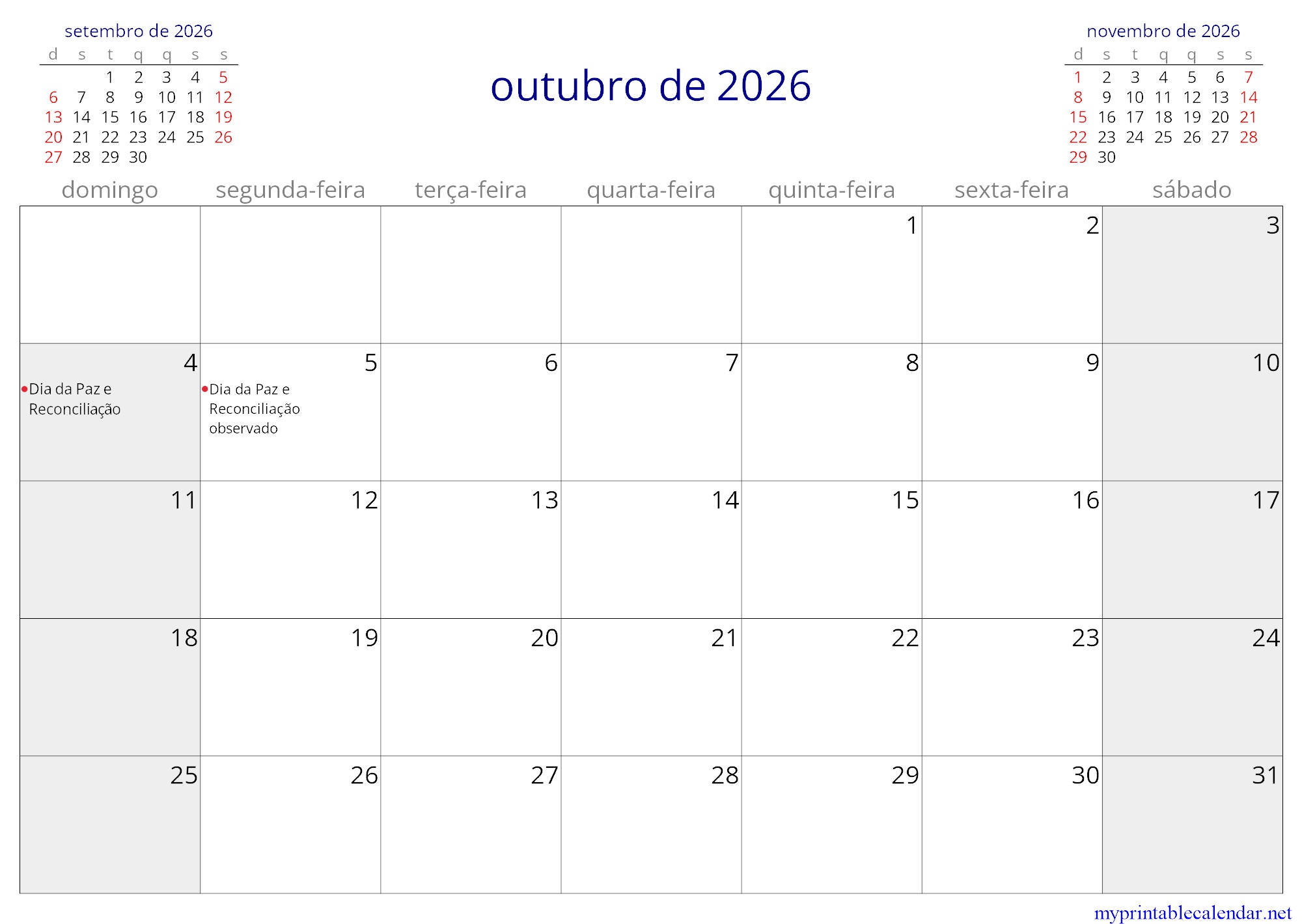 outubro de 2026 monthly calendar, Mozambique, Portuguese jpg
