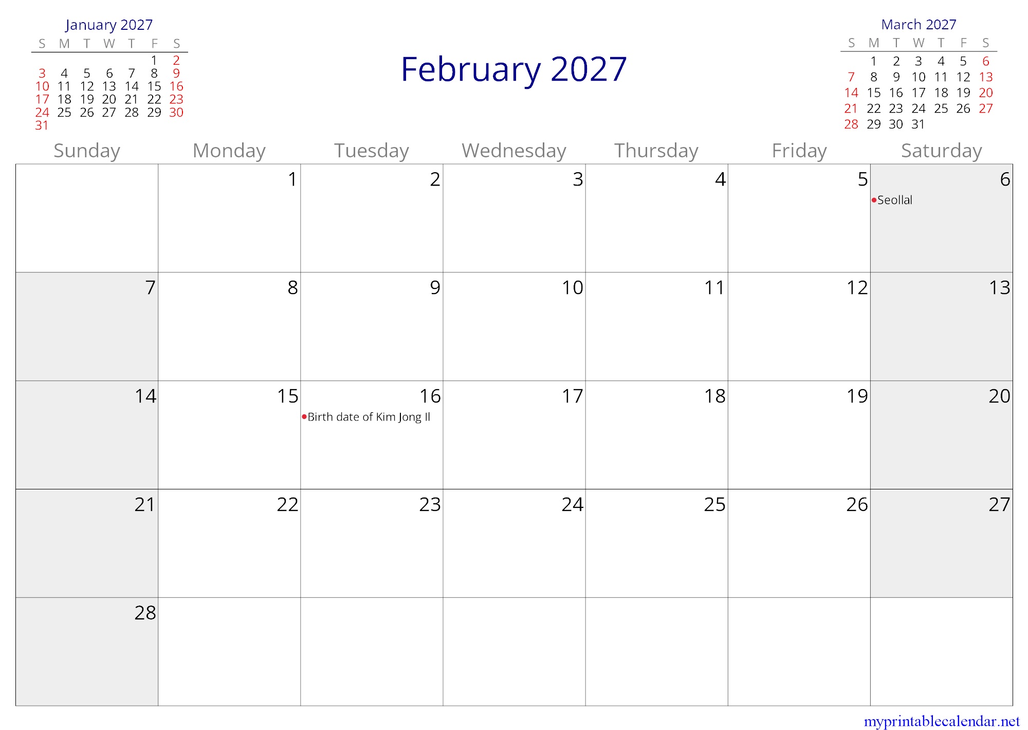 February 2027 monthly calendar, North Korea, in English jpg