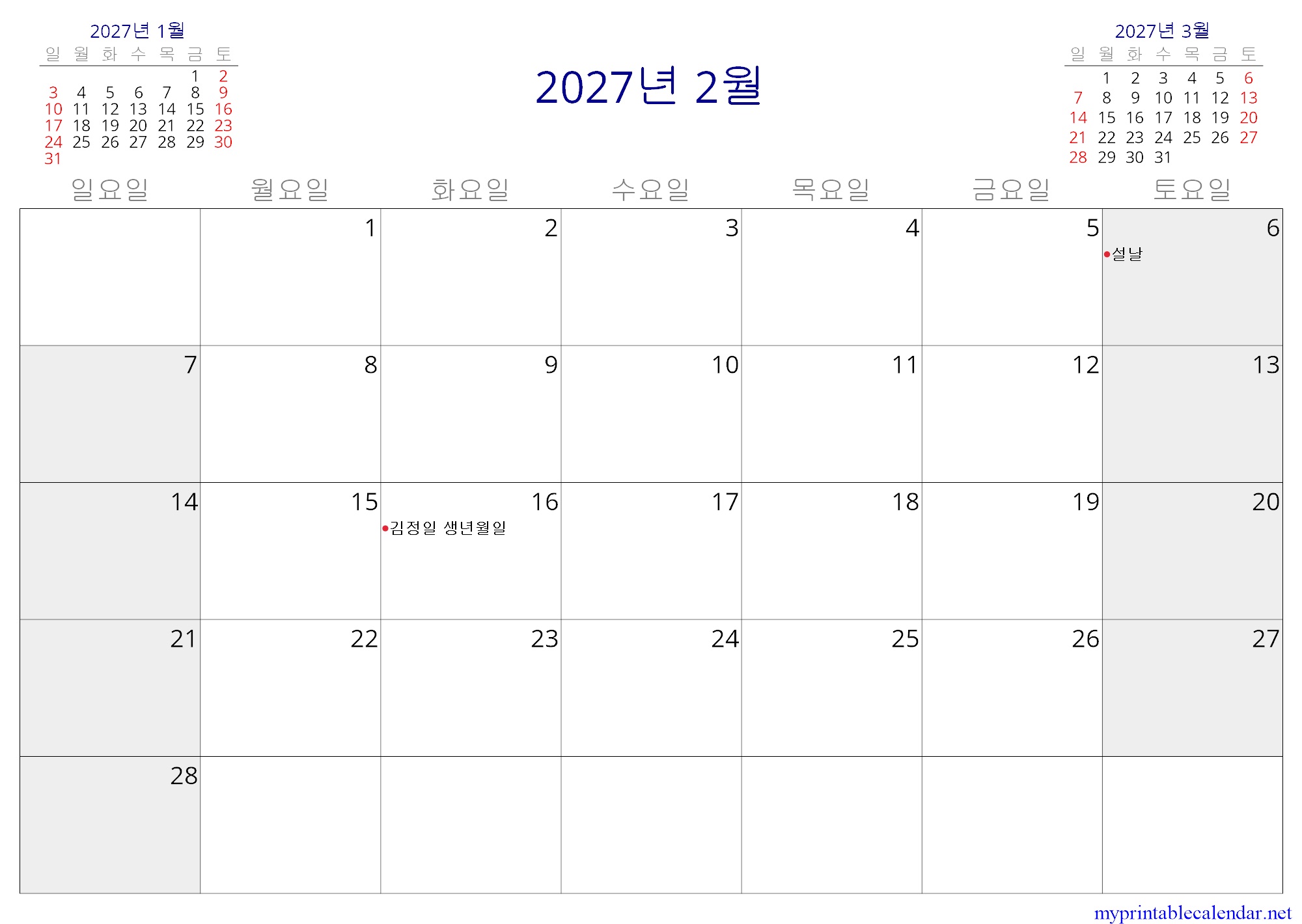 2027년 2월 monthly calendar, North Korea, Korean jpg