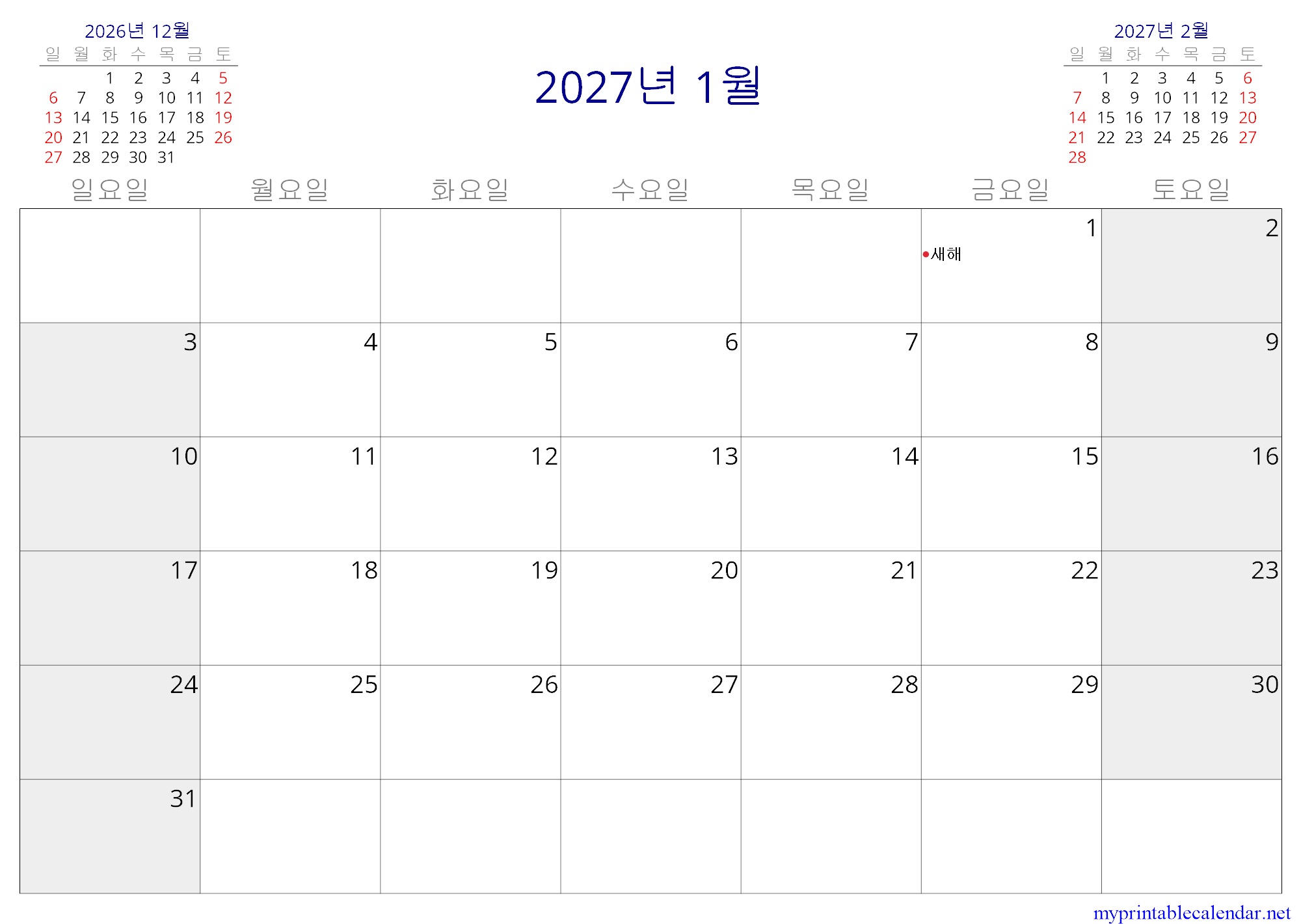 2027년 1월 monthly calendar, North Korea, Korean jpg