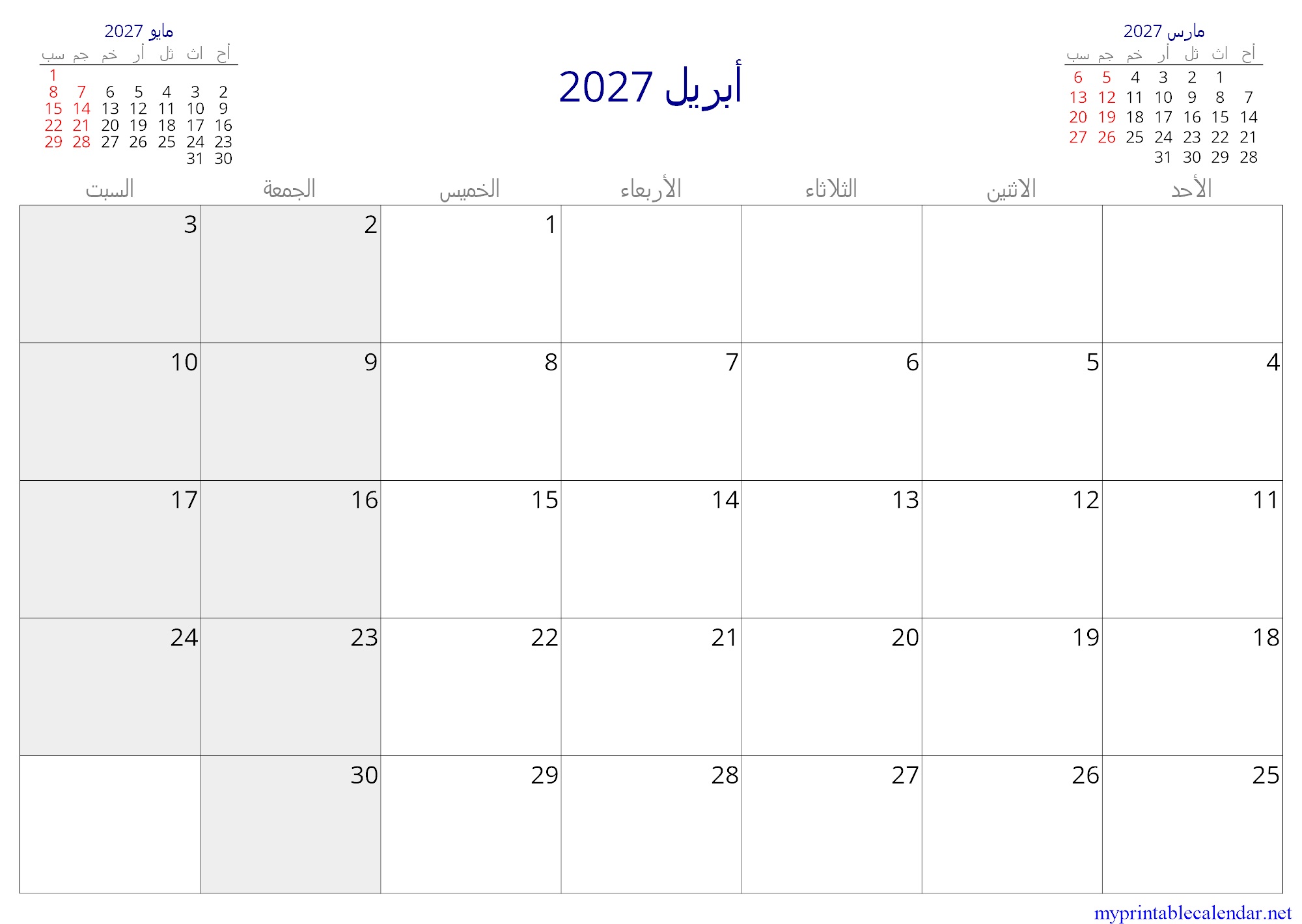 أبريل 2027 monthly calendar, Oman, Arabic jpg