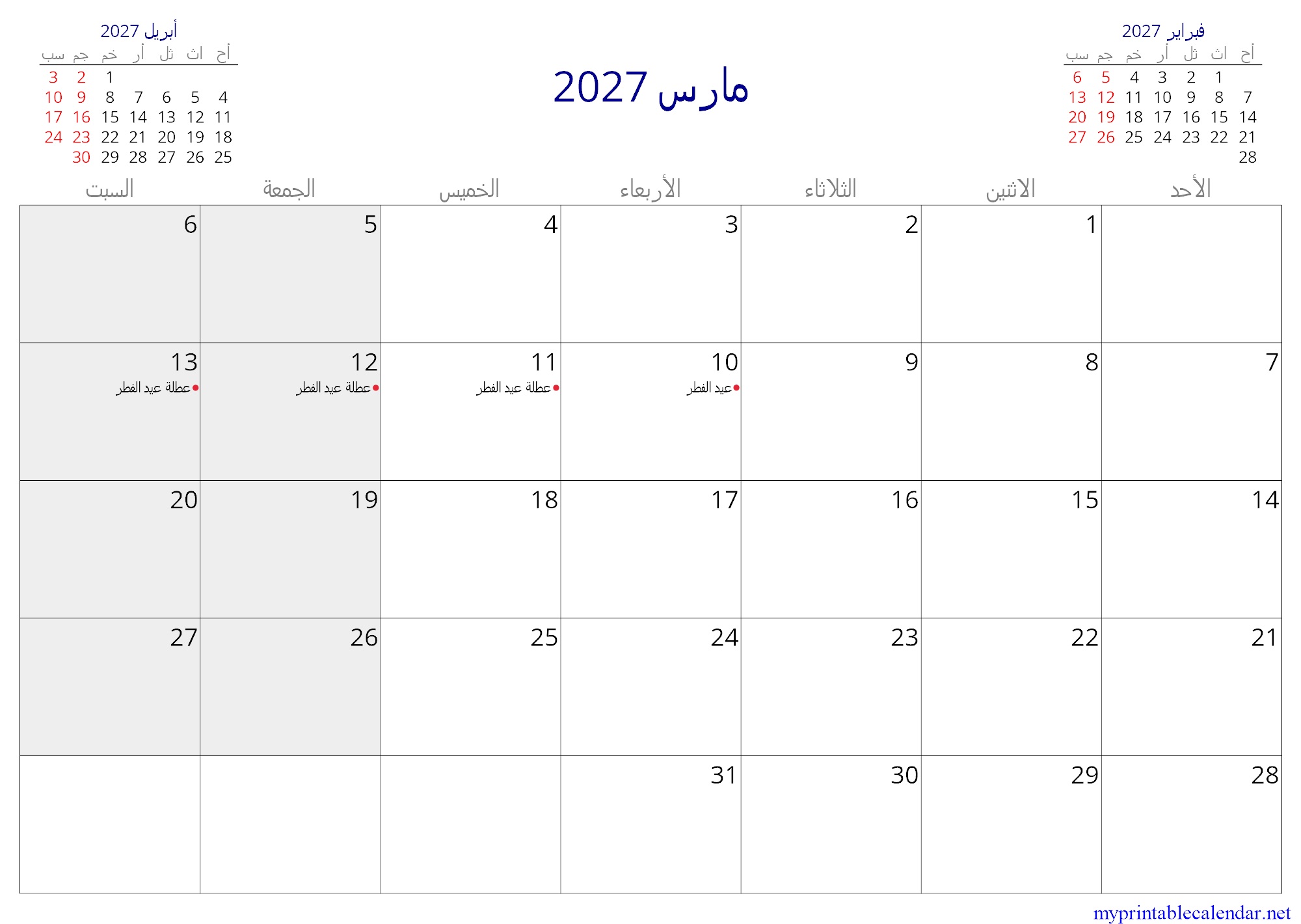 مارس 2027 monthly calendar, Oman, Arabic jpg