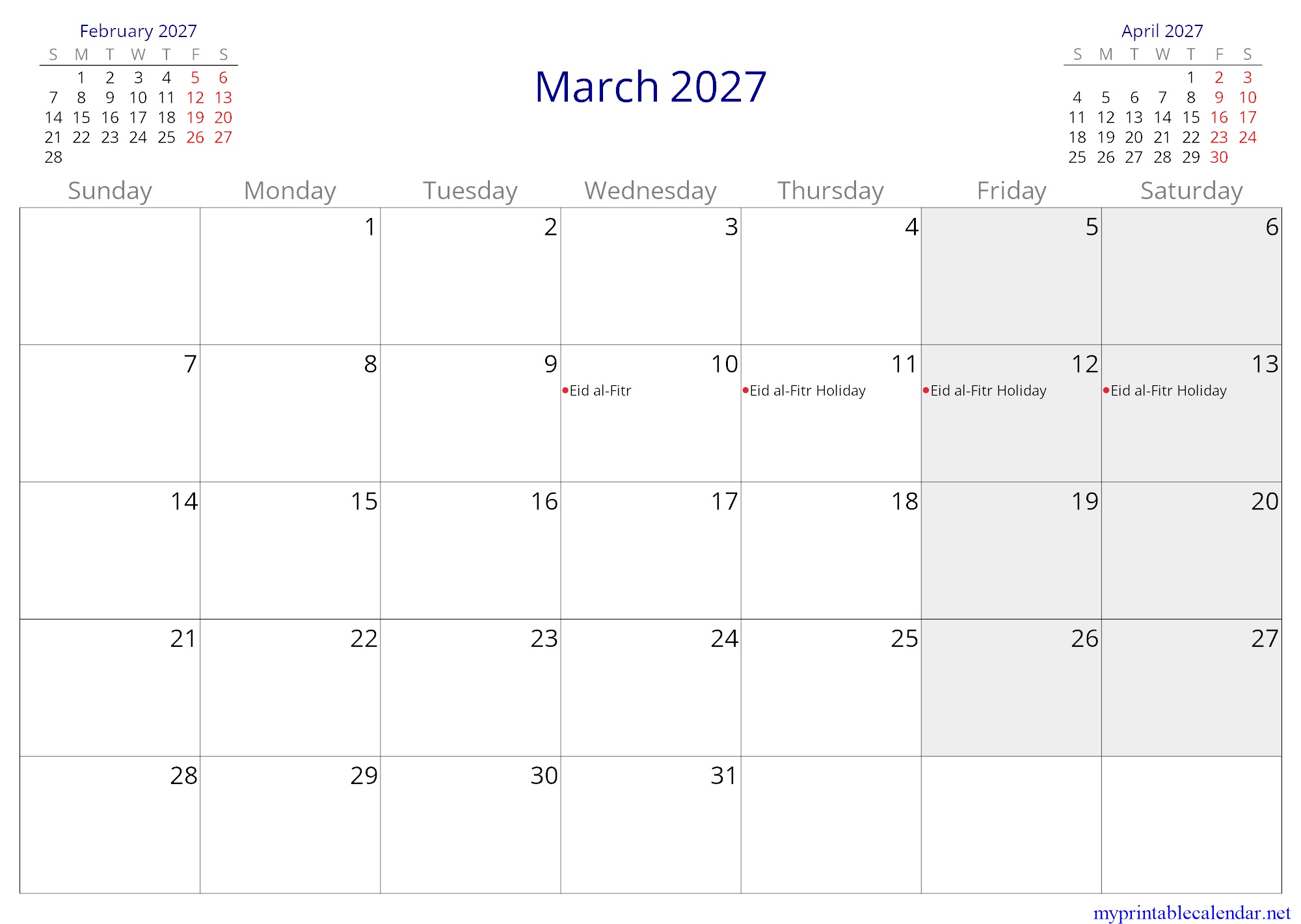 April 2027 monthly calendar, Oman, in English jpg